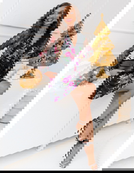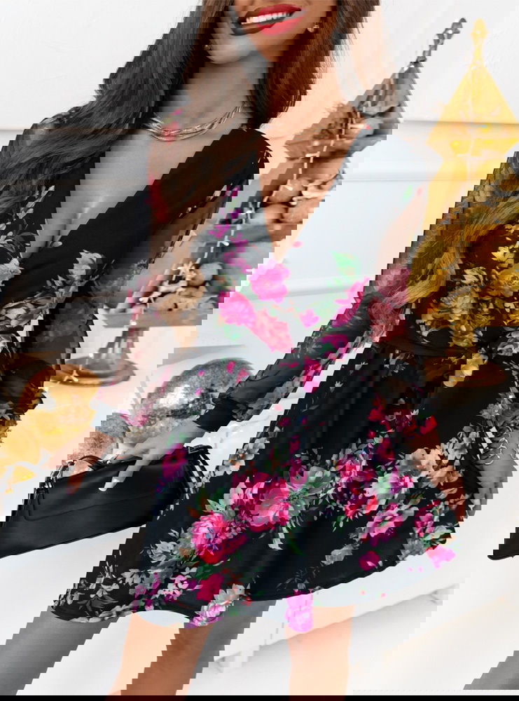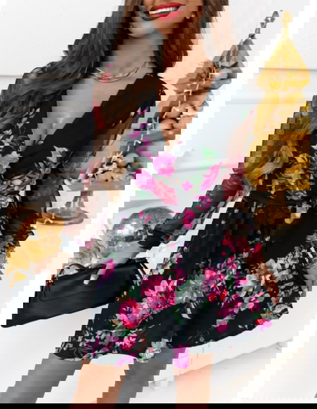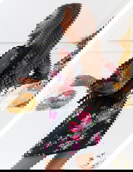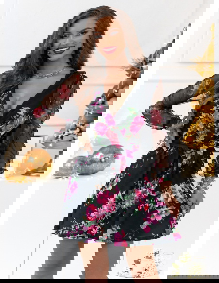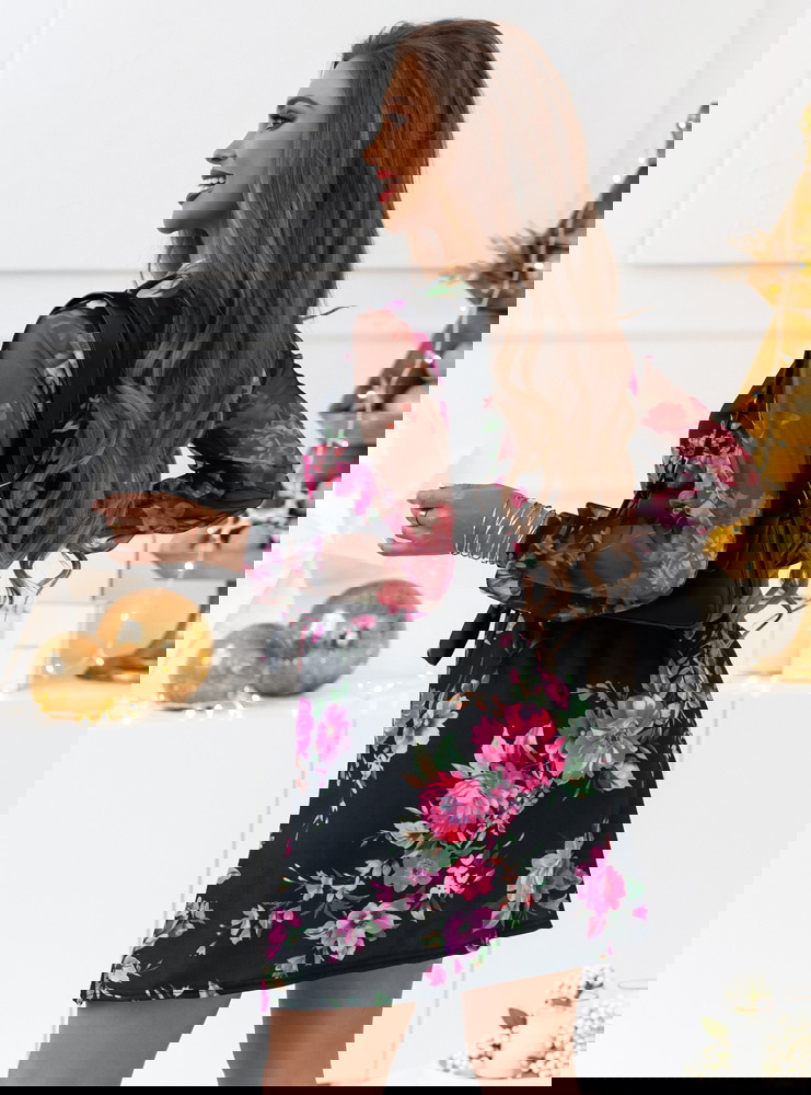 Przekładany dekolt dodaje sukience elegancji i zmysłowości, podkreślając delikatnie dekolt. Tiulowe rękawy nadają sukience lekkości i delikatności, co czyni ją subtelnie romantyczną. Wzorzysta tkanina nadaje sukience charakteru i oryginalnego wzoru. To idealna sukienka na wieczorne wyjścia, przyjęcia czy inne wyjątkowe okazje, gdzie chcesz się wyróżnić.