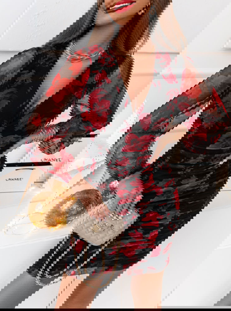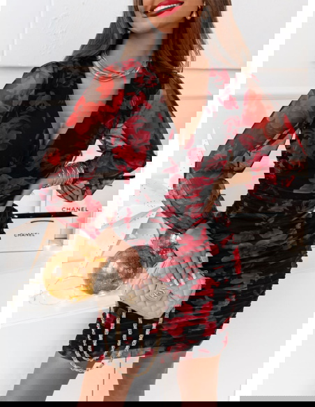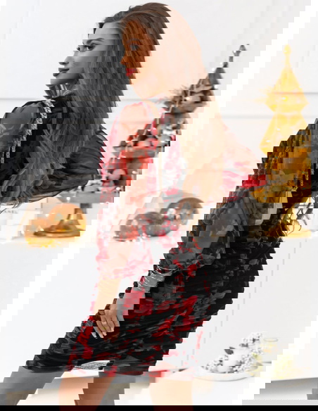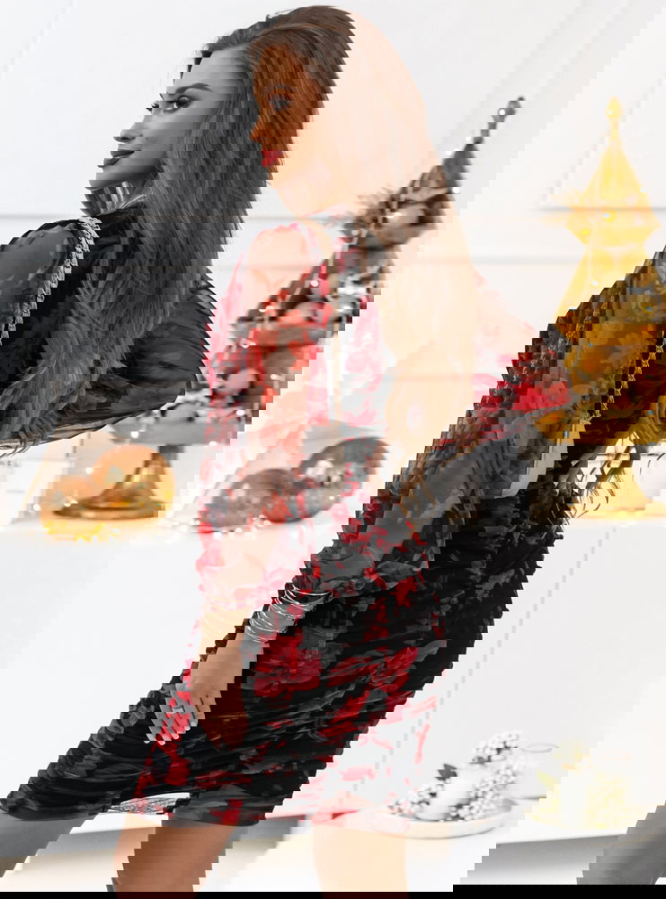 Jej wzorzysty design dodaje jej wyrazistego wyglądu, a tiulowe rękawy nadają subtelności i elegancji. Sukienka ta ma marszczenia, które tworzą efektowne plisy, podkreślając talię i nadając jej wyjątkowego charakteru. To ubranie pasuje na wiele różnych okazji. Jest idealna na wieczorne wyjścia, przyjęcia czy uroczyste okazje. Jej oryginalny design przyciąga uwagę i sprawia, że będziesz się w niej czuć wyjątkowo.