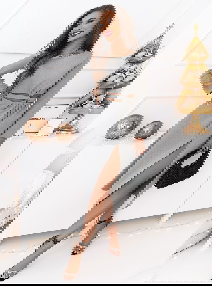 Szary wiązany komplet bluzka ze spódnicą Christina pozwala na efektowne połaczenie obu elementów dzięki temu wiązaniu będziesz prezentować sie stylowo i z klasą. Wykonany jest z wysokiej jakości materiału.