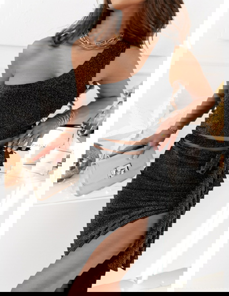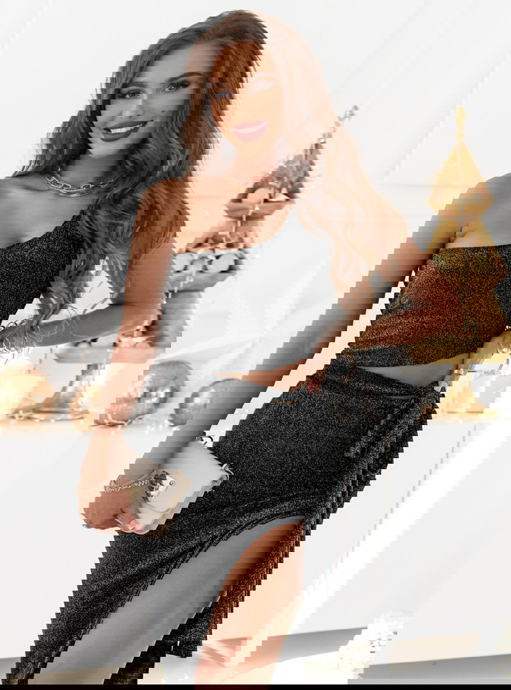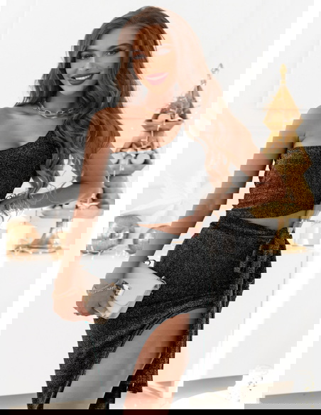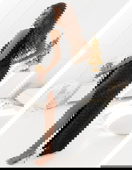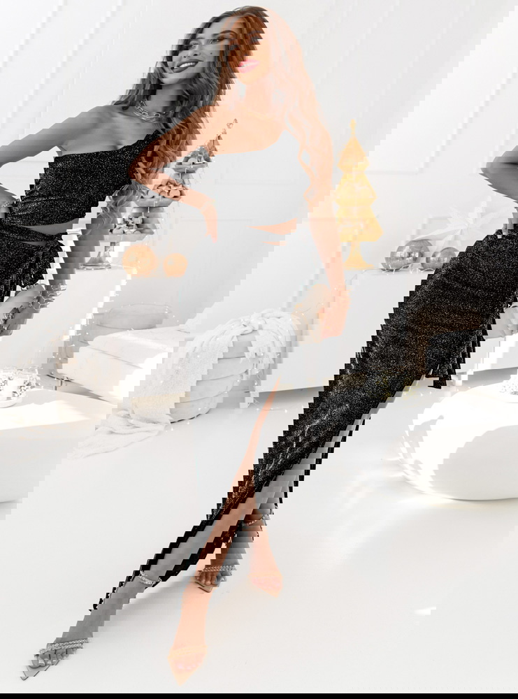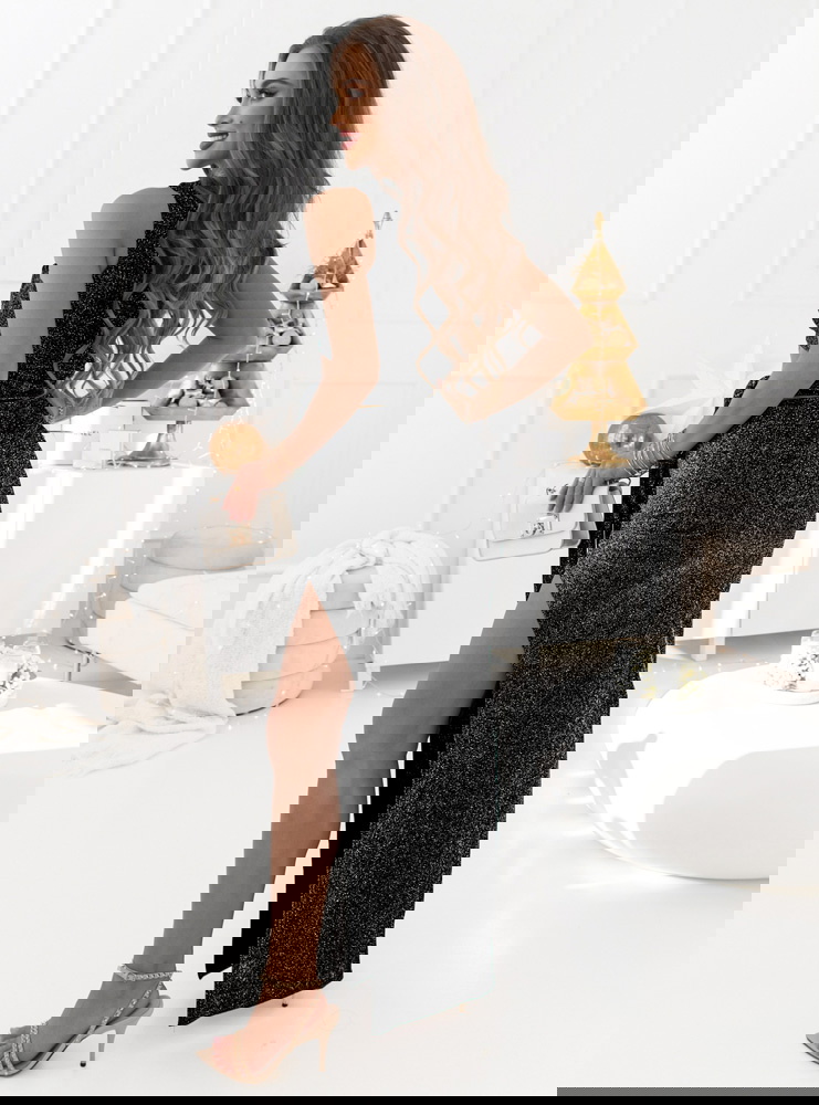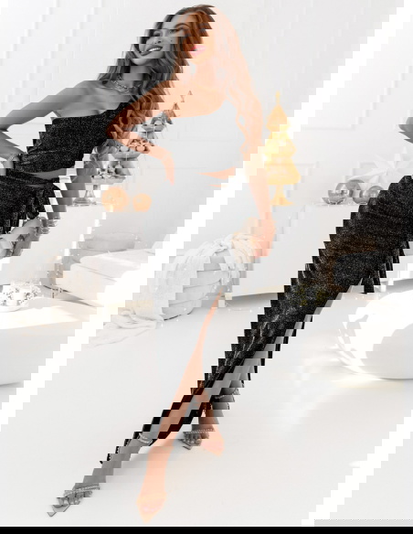 Czarna sukienka z błyszczącą nitką i wiązaniem w talii Pertti wiazanie w talii pozwala na podkreślenie atutów sylwetki. jej rozcięcie nadaje jej wyjątkowej lekkości a jednocześnie odsłania nóżki w subtelny sposób