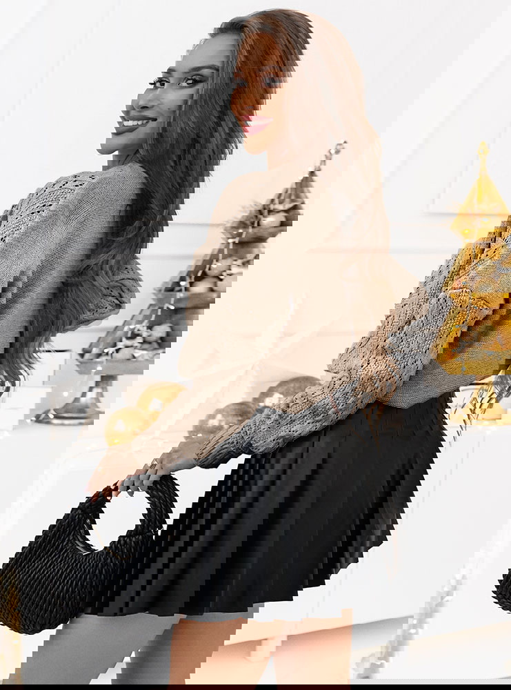 jesienna elegancja w detalu. Nasz sweter zapinany na guziki o dopaowanym kroju i ażurkowym splocie, idealany wybór na jesienna stylizację.