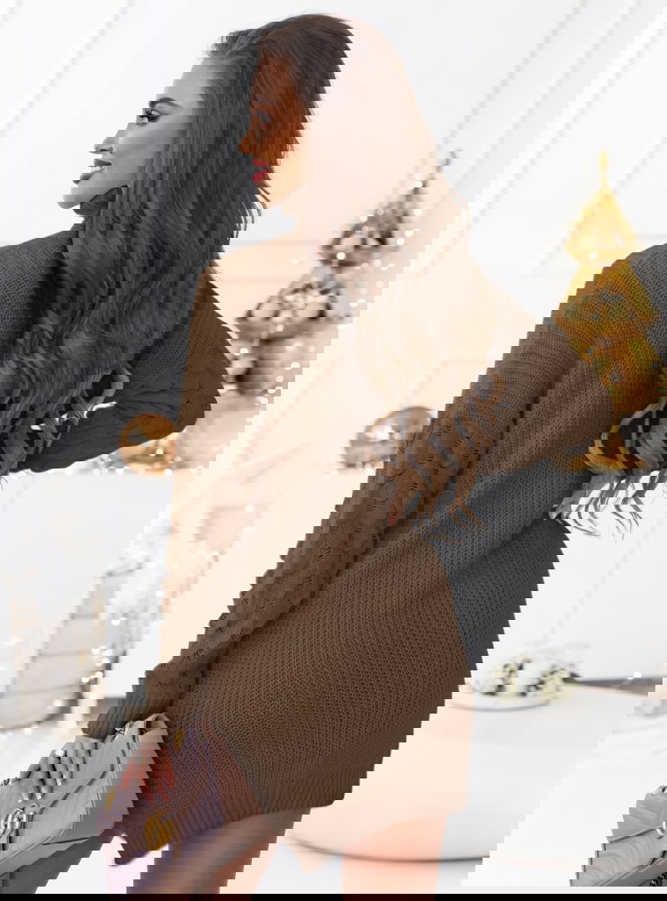 Sukienka swetrowa z ozdobnymi rękawami Kionna- odcienie brązu nie powinno zabraknąć jej w twojej garderobie ponieważ świetnie sprawdzi się jako bazowy element.