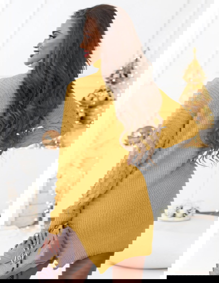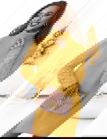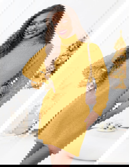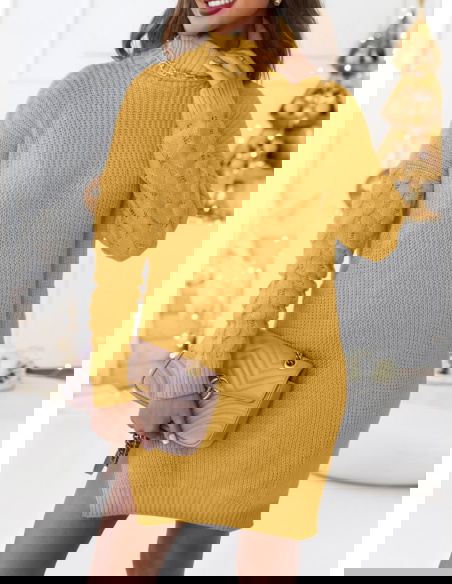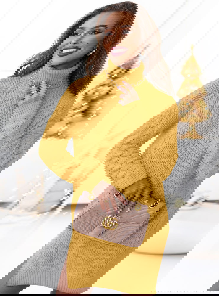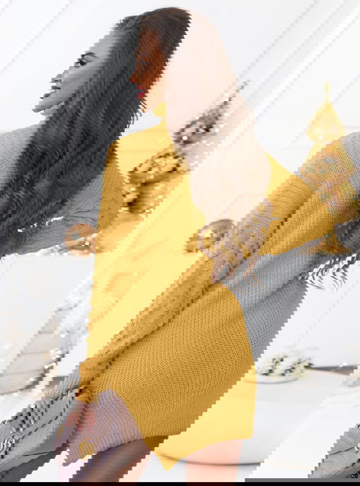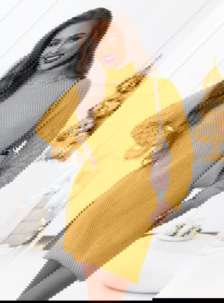 Miodowa sukienka swetrowa z ozdobnymi rękawami Kionna to doskonała propozycja na jesienne dni kiedy chcesz wyglądać modnie i czuć się komfortowo.