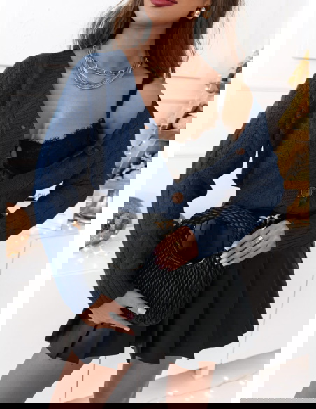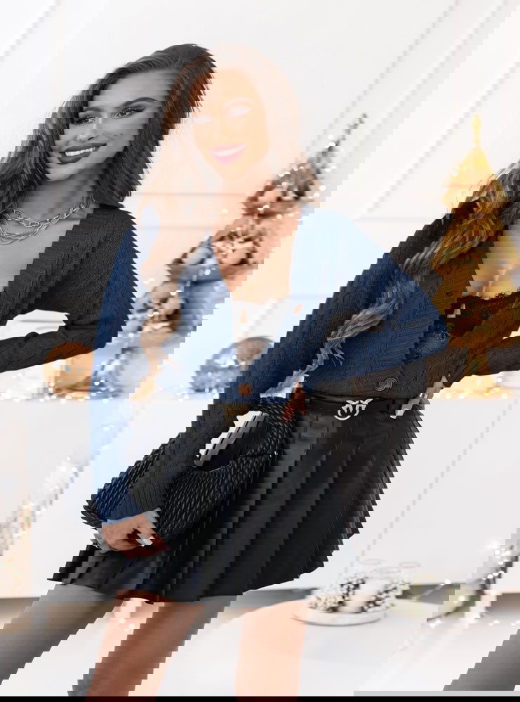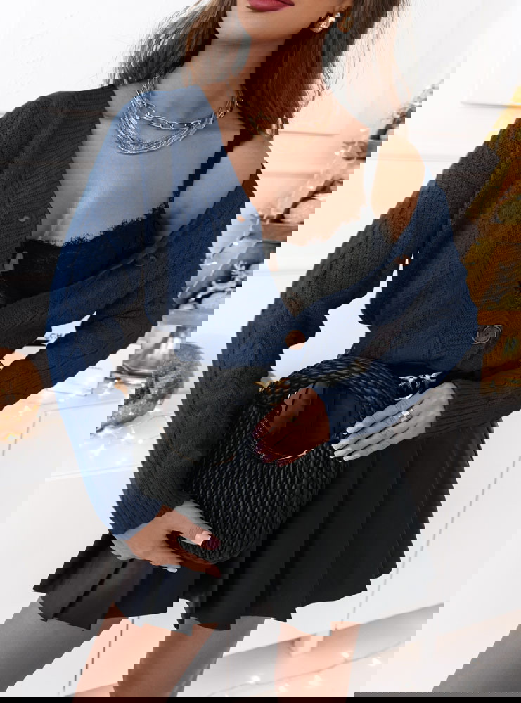 Granatowy sweter zapinany na guziki Tawana dzięki dekoltowi w kształcie litery v nasz sweterek świetnie komponuje się z róznymi stylizacjami.