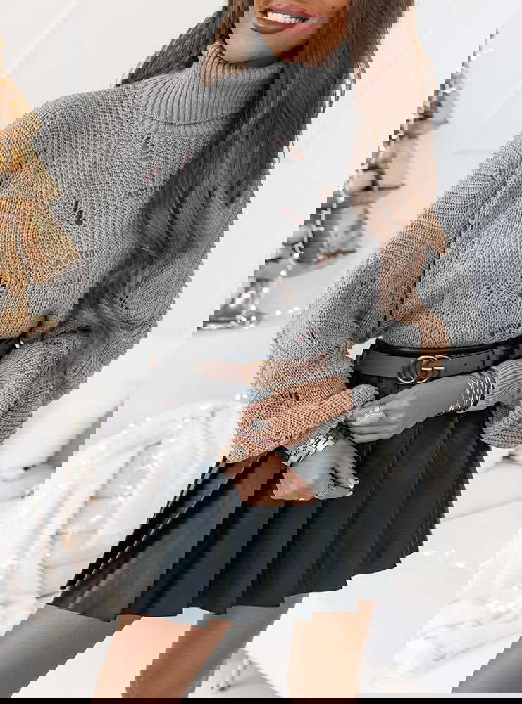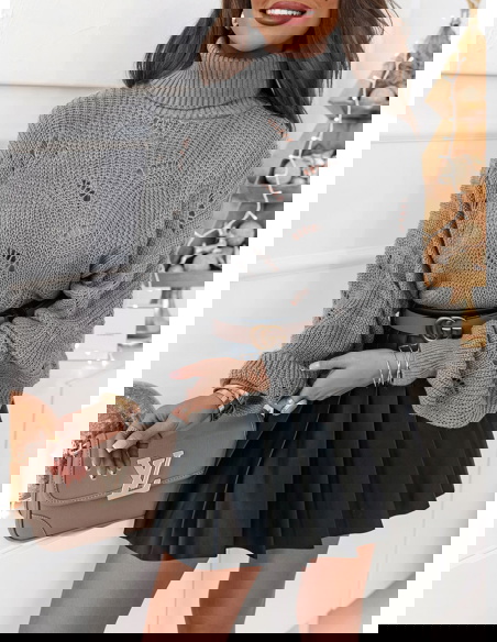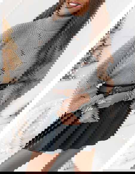 Szczególnym elementem są ażurowe wstawki które dodają subtelnej zmysłowości zachowując jednocześnie ciepło i wygodę. Wysoki golf chroni przed chłodem i dodaje swetrowi eleganckiego charakteru.