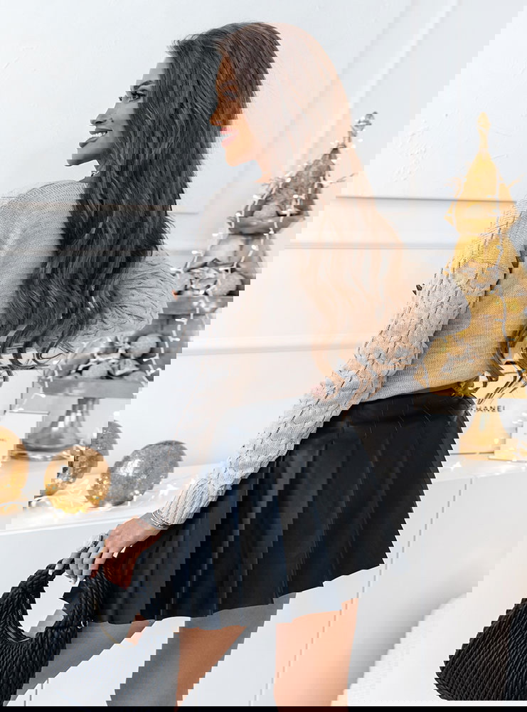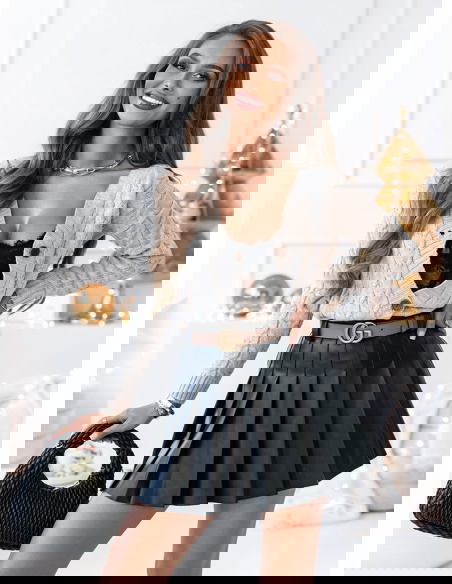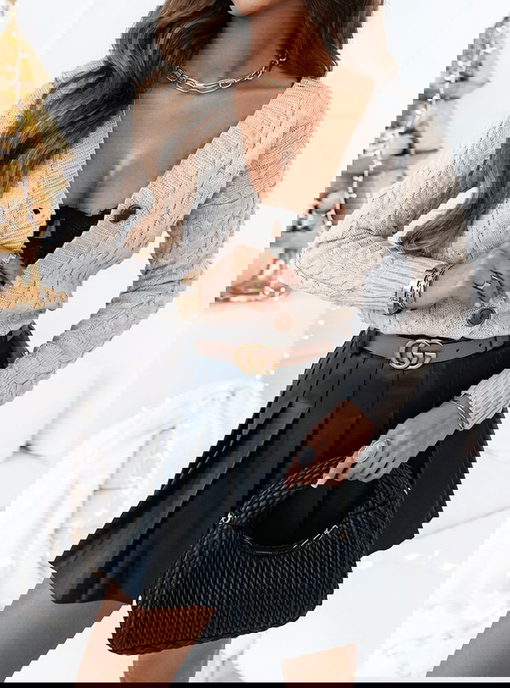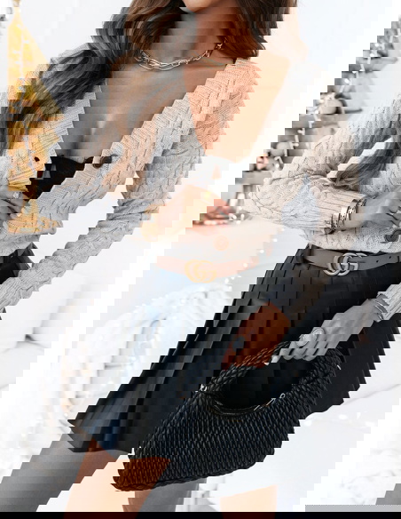 Beżowy sweter z ozdobnymi warkoczami Selence dopełnieniem stylizacji mogą być złote akcesoria które doskonale kontrastują z kolorem swetra.