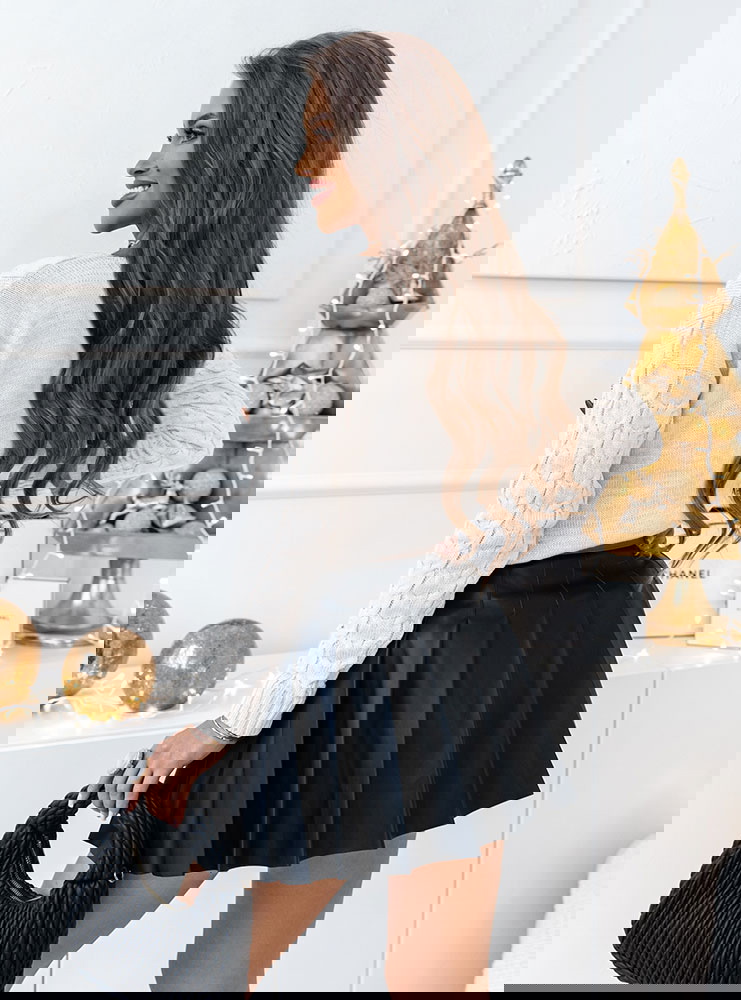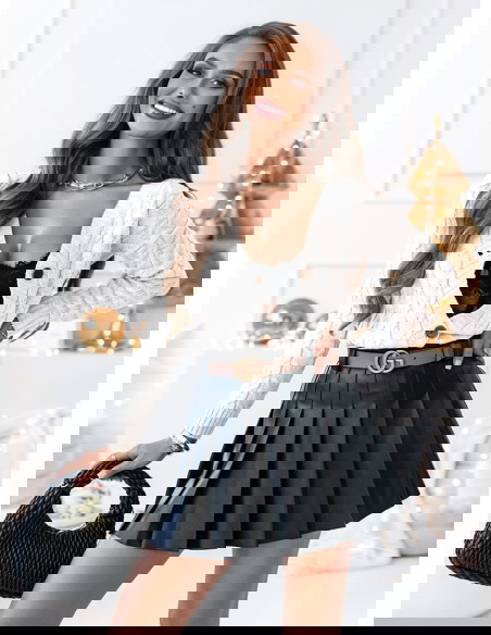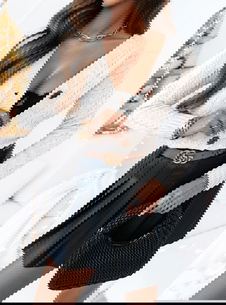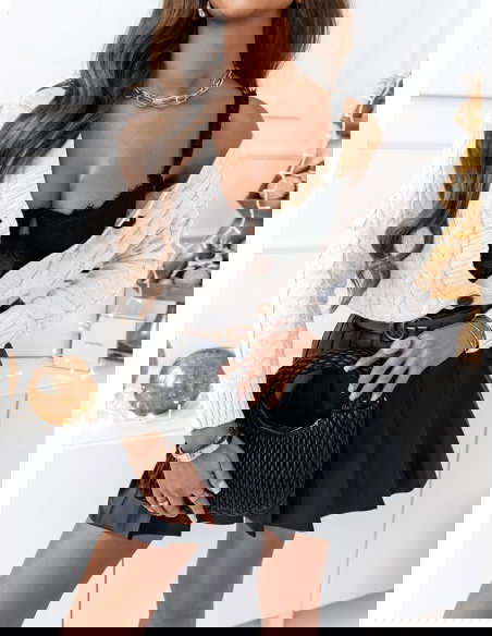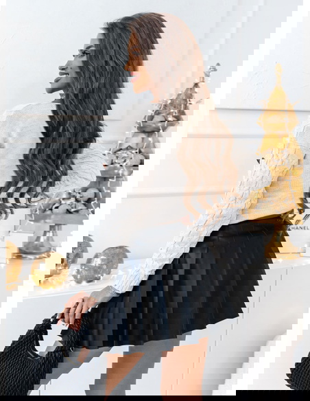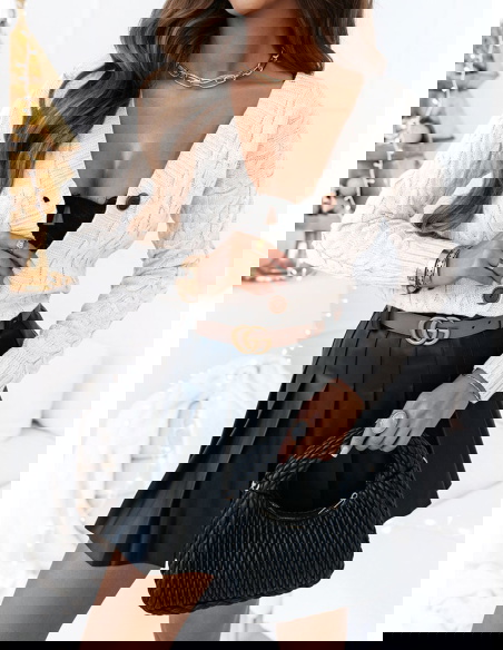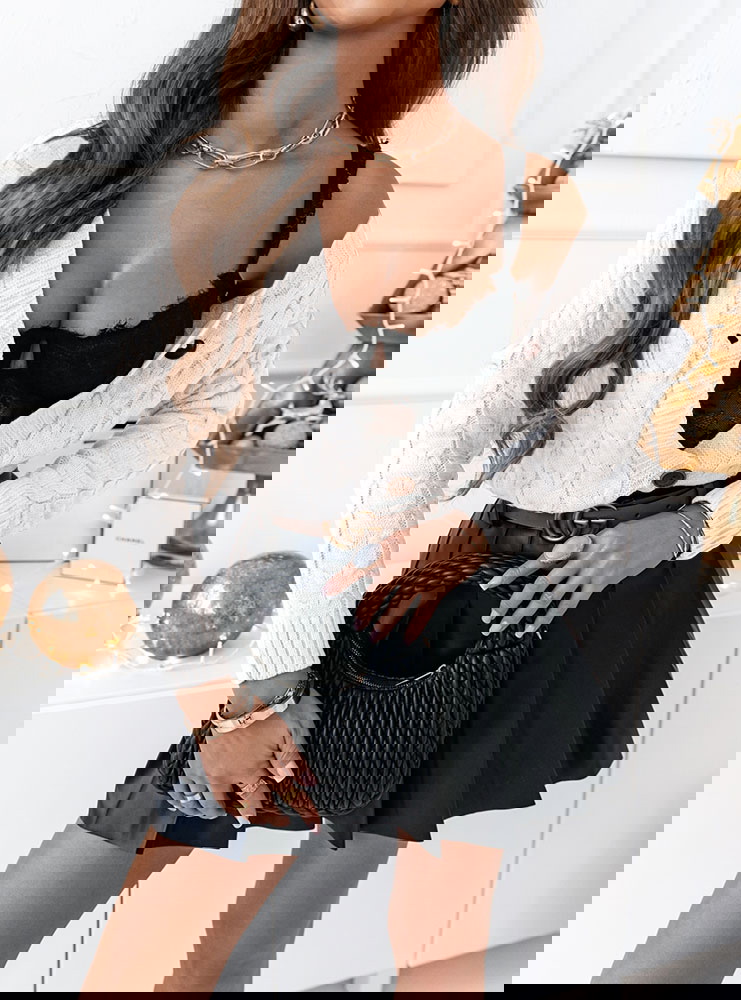 Sweter z ozdobnymi warkoczami Selence- ecru dopełnieniem stylizacji mogą być złote akcesoria które doskonale kontrastują z kolorem swetra nadając całości wyrazisty i luksusowy wygląd.