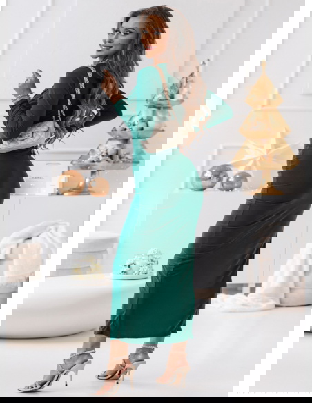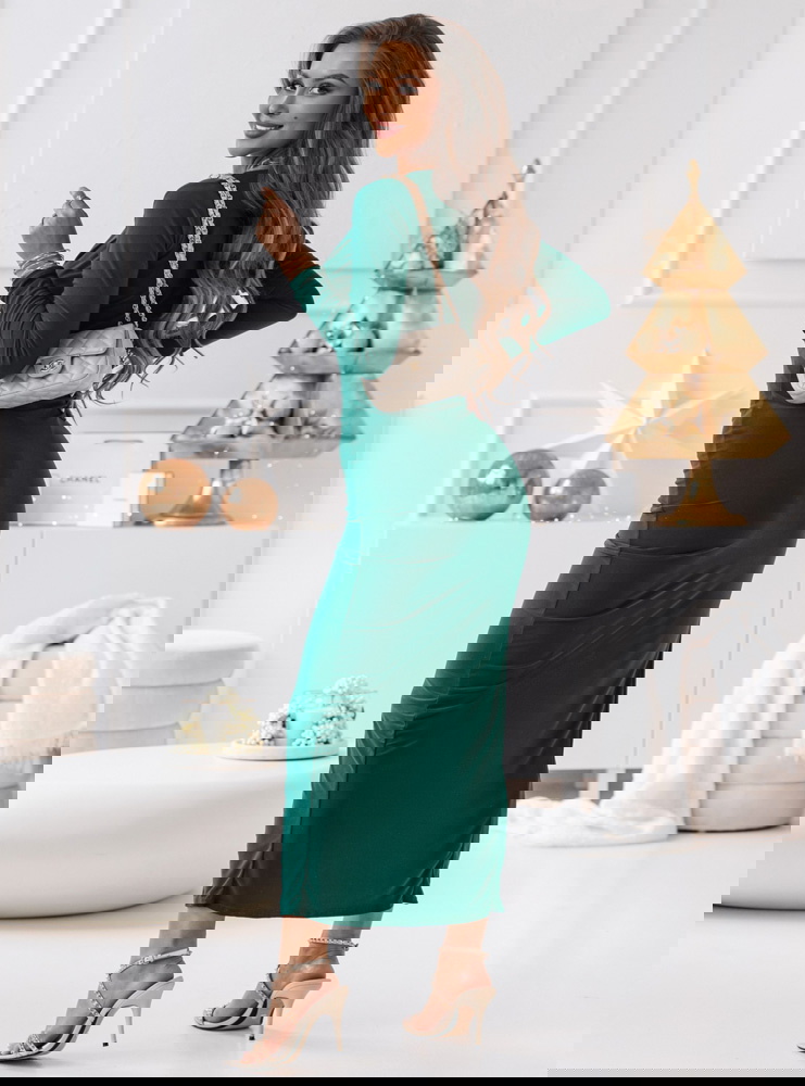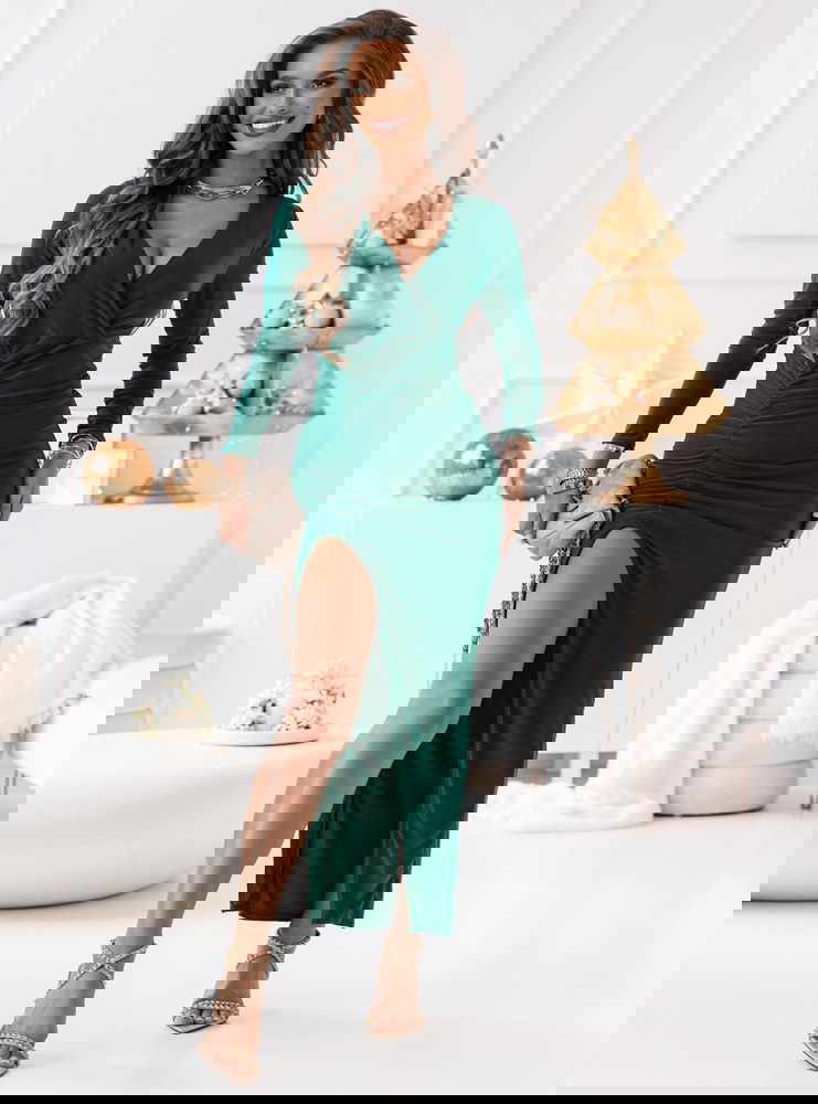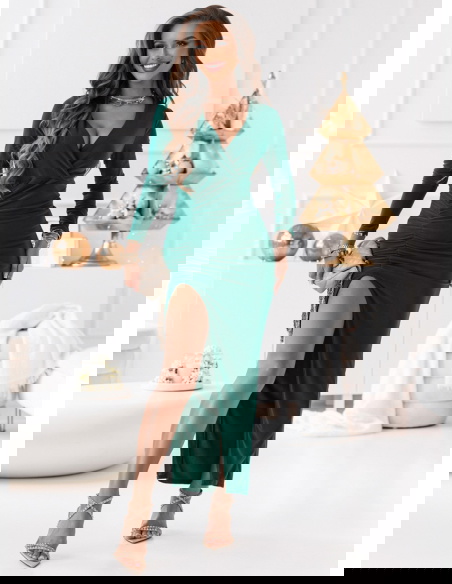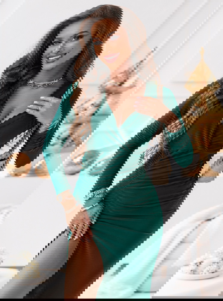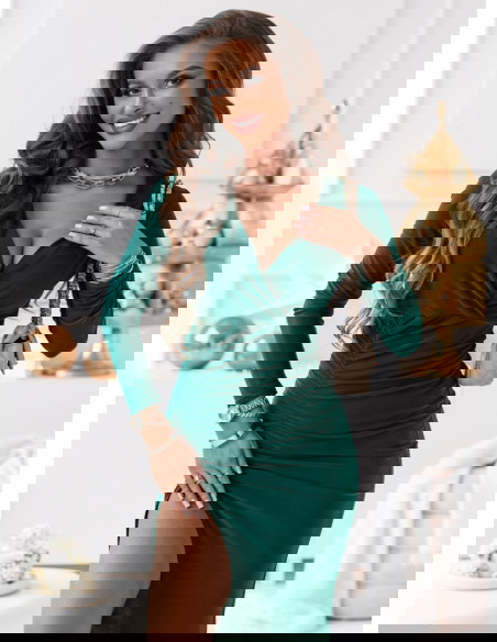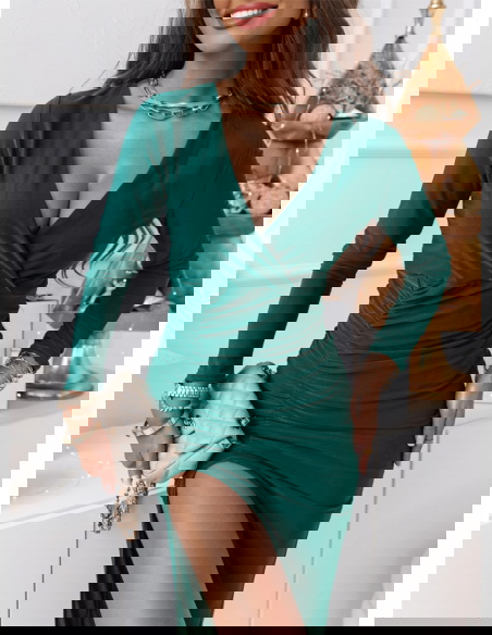Sukienka z marszczeniem i rozporkiem Lozzka- butelkowa zieleń długi rękaw jest idealny na chlodniejsze wieczory, natomiast glęboki dekolt w ksztalcie v subtelnie podkreśli dekolt dodając odrobine zmysłowości.