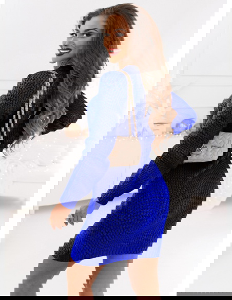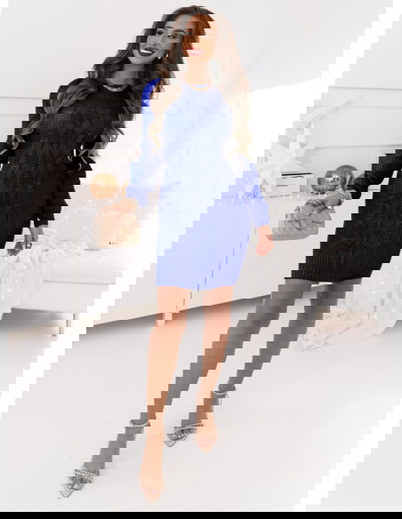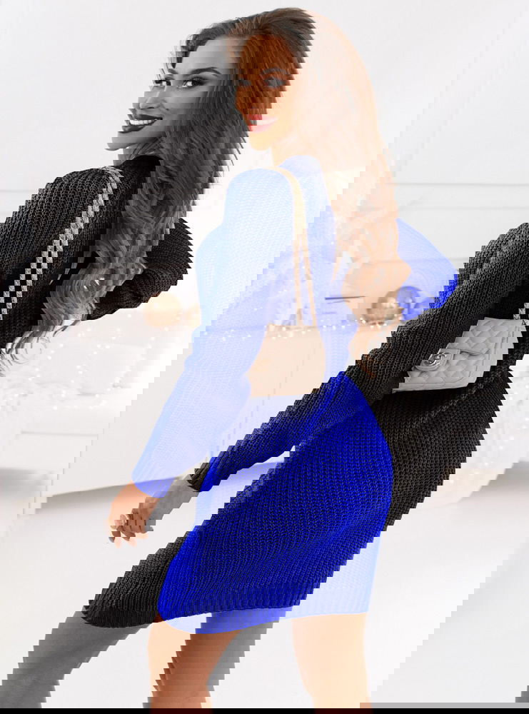 Chabrowa swetrowa sukienka z ozdobnymi splotami Wekko boczne szwy są dyskretnie wzmocnione co zapewnia trwałośc i wytrzymałość sukienki. Długośc sukienki jest idealna sięga tuż powyżej kolan co sprawia że jest to wybór odpowiedni zarówno na formalne jak i nieformalne okazje