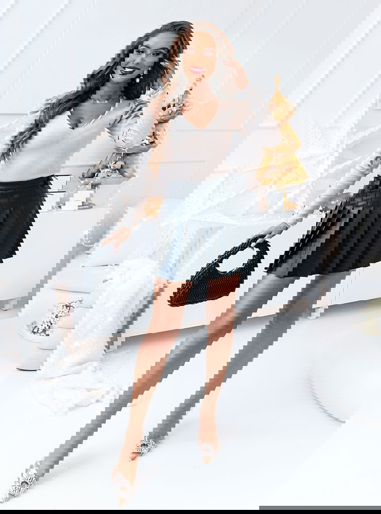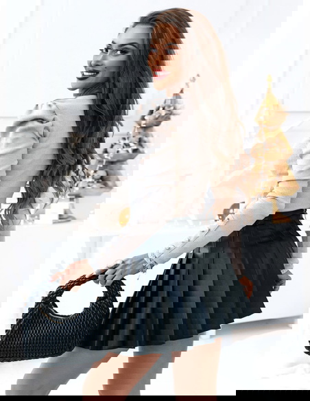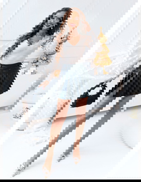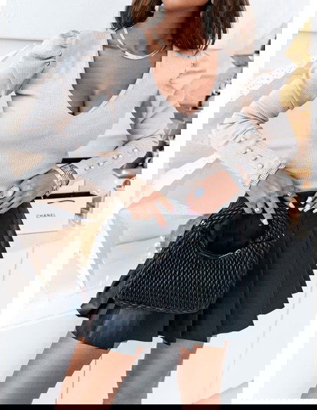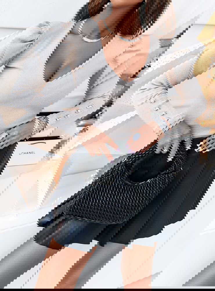 Bluzka z bufiastymi rękawami i ozdobnymi guzikami na rękawach.Beżowa prążkowana bluzka z dekoltem w serek i ozdobnymi perełkami to wyjątkowy element garderoby, który łączy w sobie klasyczną elegancję z delikatnym luksusem.
