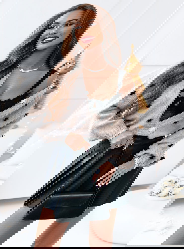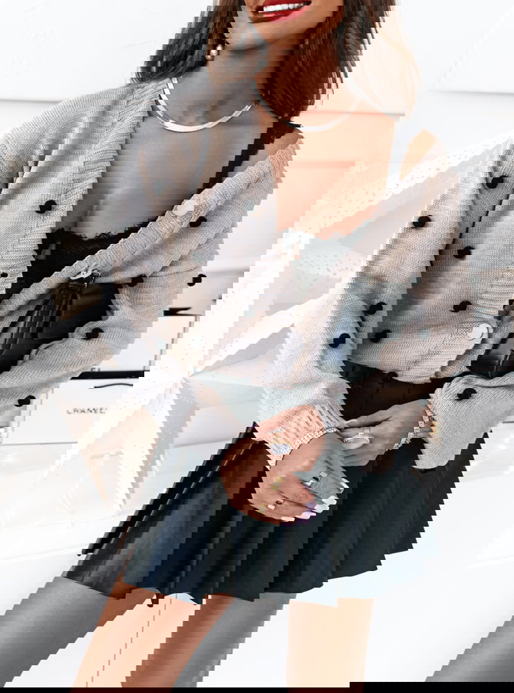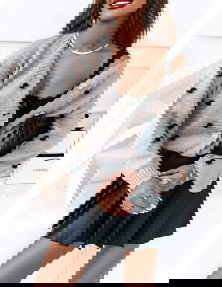 Rozpinany sweter z ozdobnymi pomponami. Rozpinany sweter z ozdobnymi pomponami to urocza i przytulna propozycja na chłodniejsze dni. Ten sweter łączy w sobie ciepło i wygodę z zabawnymi i dekoracyjnymi detalami, które nadają mu radosnego charakteru.
