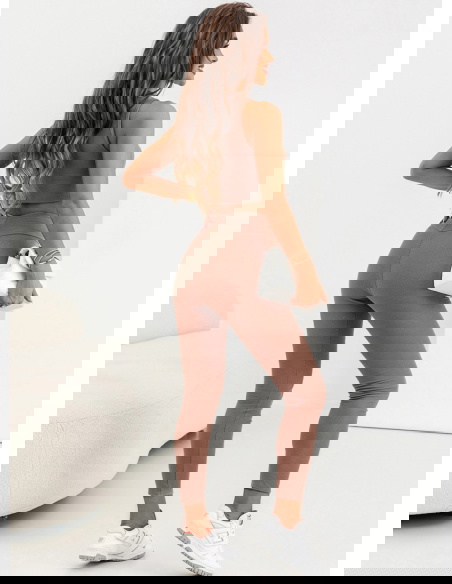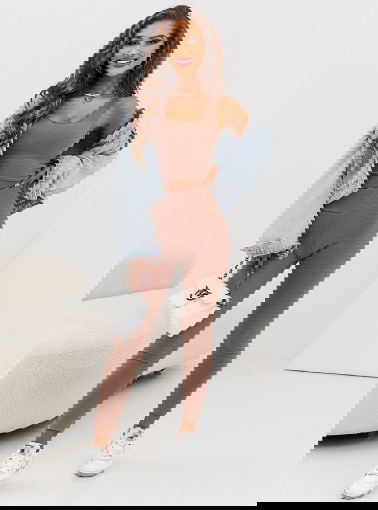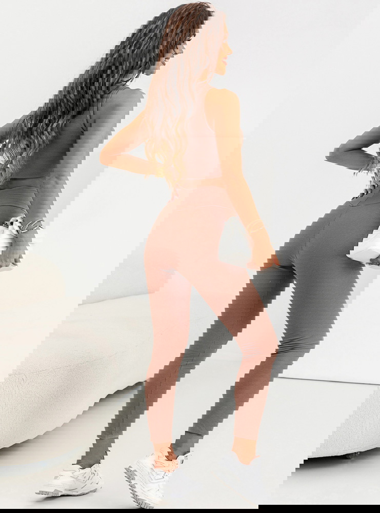 Prążkowany komplet top i legginsy Devis - mocha mousse  to modny zestaw, który pozwala na wyrażenie swojej indywidualności poprzez modę i czuć się komfortowo w każdej sytuacji.