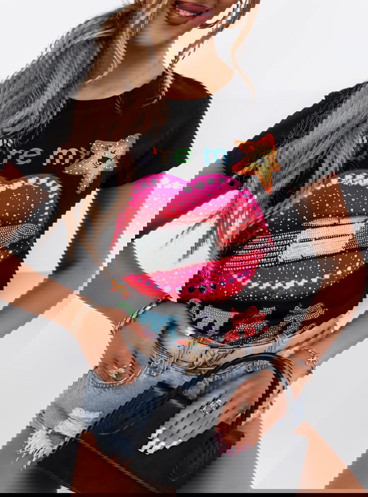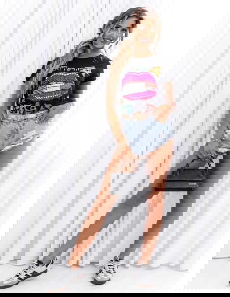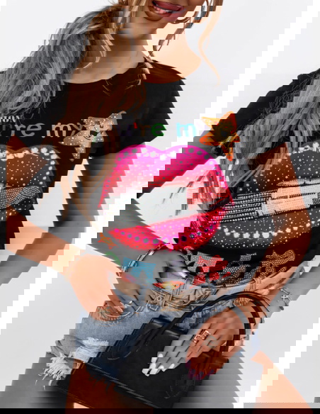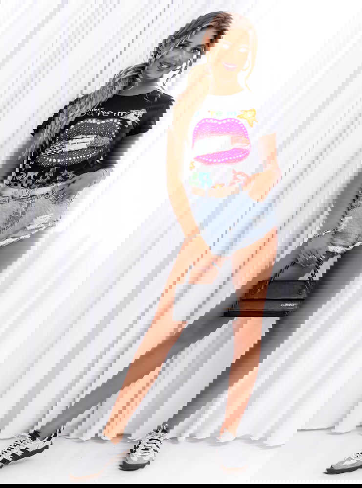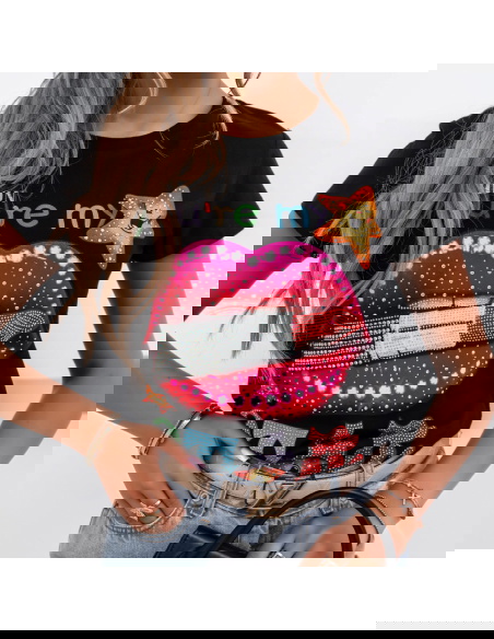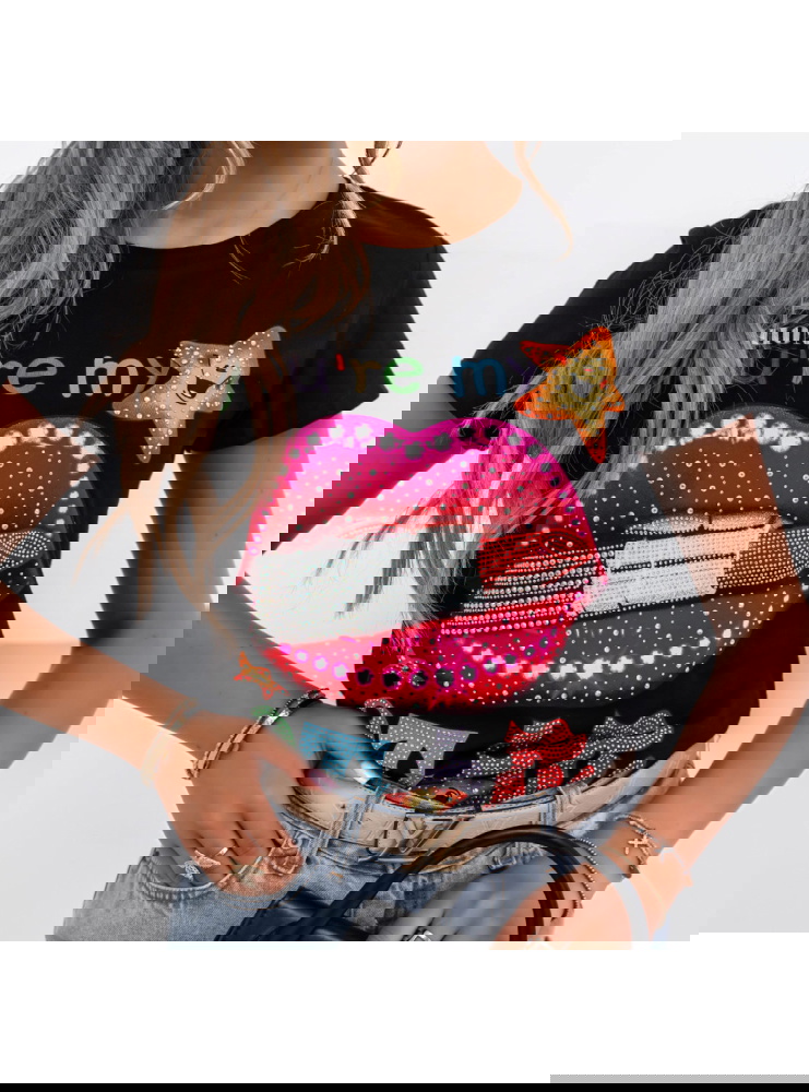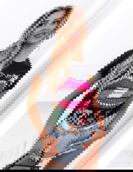 Czarna koszulka z ozdobnym nadrukiem i cyrkoniami Nieva