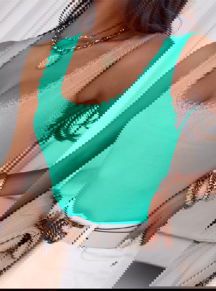 Miętowa koszulka na ramiączka Allla świetnie komponuje się zarówno z casualowymi jeansami, jak i bardziej eleganckimi spódnicami czy spodniami. Jej minimalistyczny design pozwala na swobodną zabawę dodatkami, od biżuterii po kolorowe akcesoria.