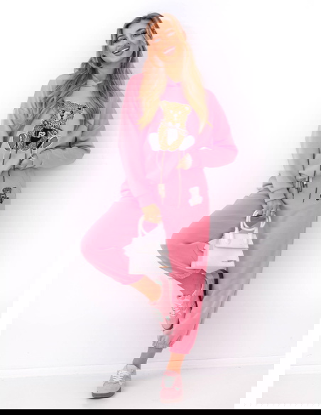 Pudrowy komplet dresowy bluza z kapturem i spodnie Diamanta nadaje stylizacji subtelnego, kobiecego charakteru, a jednocześnie jest na tyle uniwersalny, że łatwo łączy się z innymi elementami garderoby, takimi jak kurtki, sneakersy czy sportowe akcesoria.