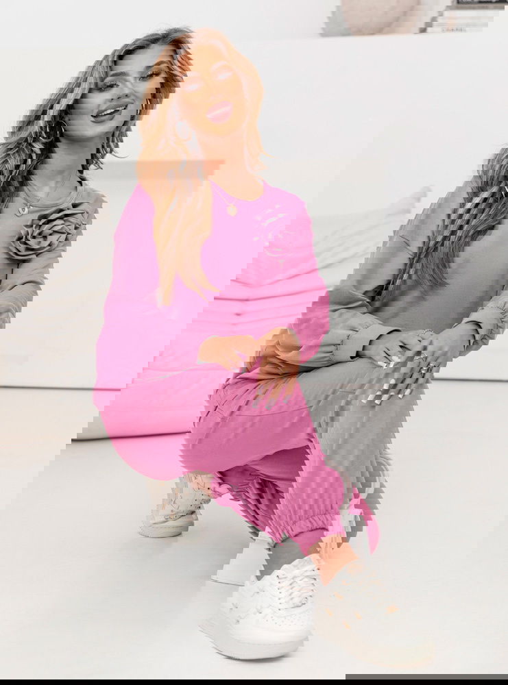 Różowy komplet z ozdobną różą Elivia to wyjątkowo elegancki zestaw, który łączy kobiecość z nowoczesnym stylem. Bluzka o dopasowanym kroju pięknie podkreśla sylwetkę, a jej głównym elementem dekoracyjnym jest efektowna, trójwymiarowa róża umieszczona na ramieniu lub przy dekolcie, nadająca całości romantycznego charakteru.