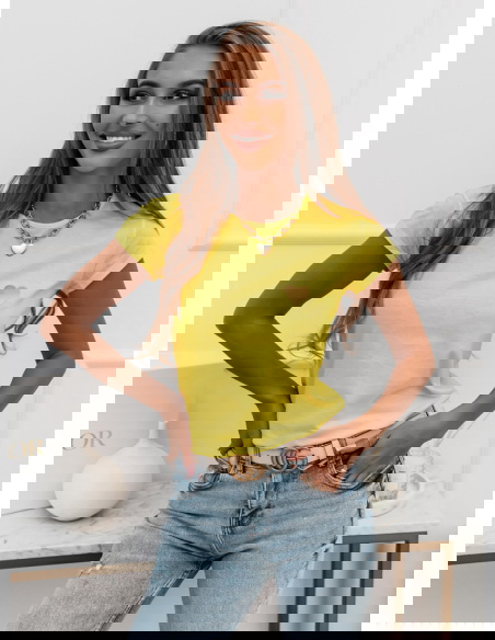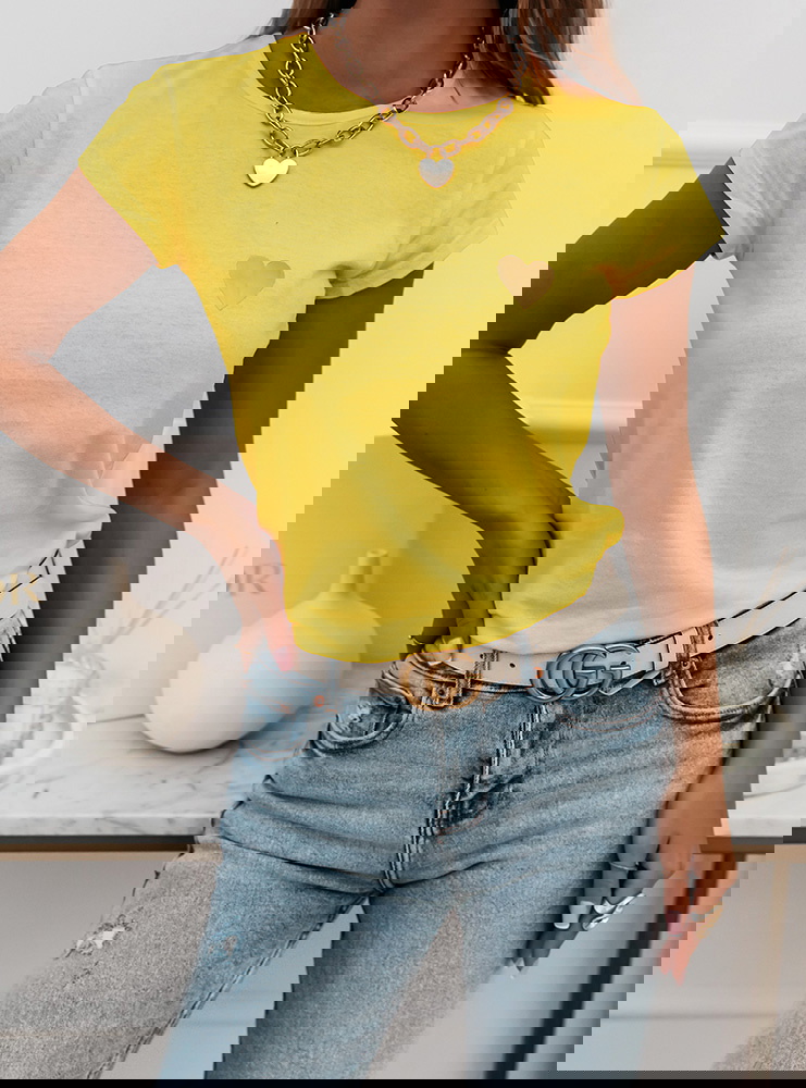 Bananowa koszulka na krótki rękaw z ozdobnym nadrukiem Kornekia  może być noszona zarówno w casualowych stylizacjach, jak i w bardziej dopracowanych zestawach, na przykład pod marynarkę lub lekką kurtkę. Koszulka Kornekia to idealne połączenie modnego designu, wygody i subtelnej elegancji, które sprawdzi się na każdą porę roku.