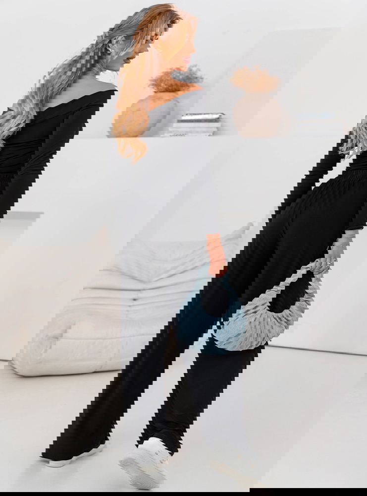 Czarny komplet bluzka z odkrytymi ramionami i spodnie Maydee  to elegancka i kobieca propozycja, która łączy nowoczesny styl z subtelną zmysłowością. Bluzka z odkrytymi ramionami idealnie podkreśla sylwetkę, a jej krój sprawia, że całość wygląda lekko i kobieco, jednocześnie zachowując elegancki charakter. Spodnie o prostym kroju zapewniają komfort i wygodę, a ich klasyczny czarny kolor doskonale współgra z górą, tworząc spójną, modną stylizację.