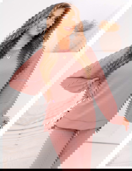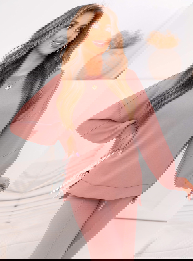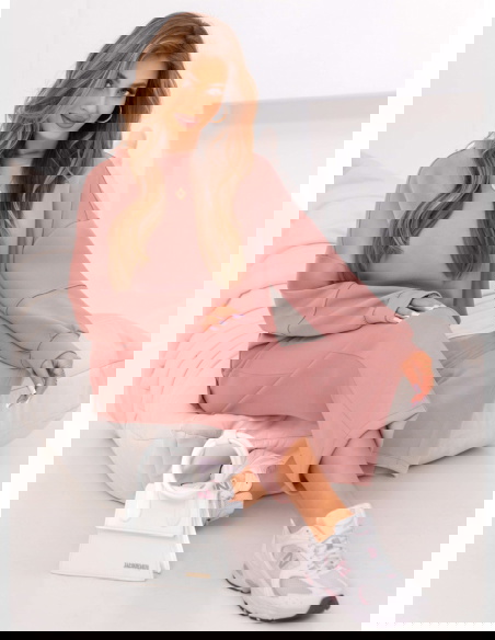 Komplet dresowy bluza i szerokie spodnie Temeka - brudny róż sprawdzi się idealnie podczas relaksujących wieczorów w domu, gdy chcemy odpocząć i nie czuć żadnego skrępowania w ruchach.Nadaje się na długie podróże samochodem, pociągiem czy samolotem, ponieważ nie uciska ciała i pozwala na swobodę ruchów, co jest niezwykle ważne podczas wielogodzinnego siedzenia.