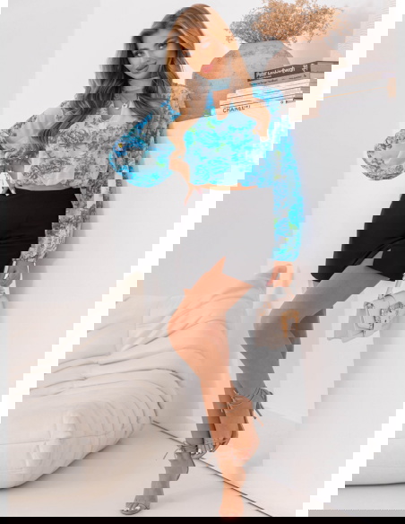 Niebieska krótka bluzka w kwiaty Gorane pięknie podkreśla talię i świetnie komponuje się z ubraniami o wysokim stanie, takimi jak jeansy, spódnice czy eleganckie spodnie. Wykonana z lekkiego, przewiewnego materiału, jest idealnym wyborem na ciepłe dni, zapewniając wygodę i komfort podczas noszenia.
