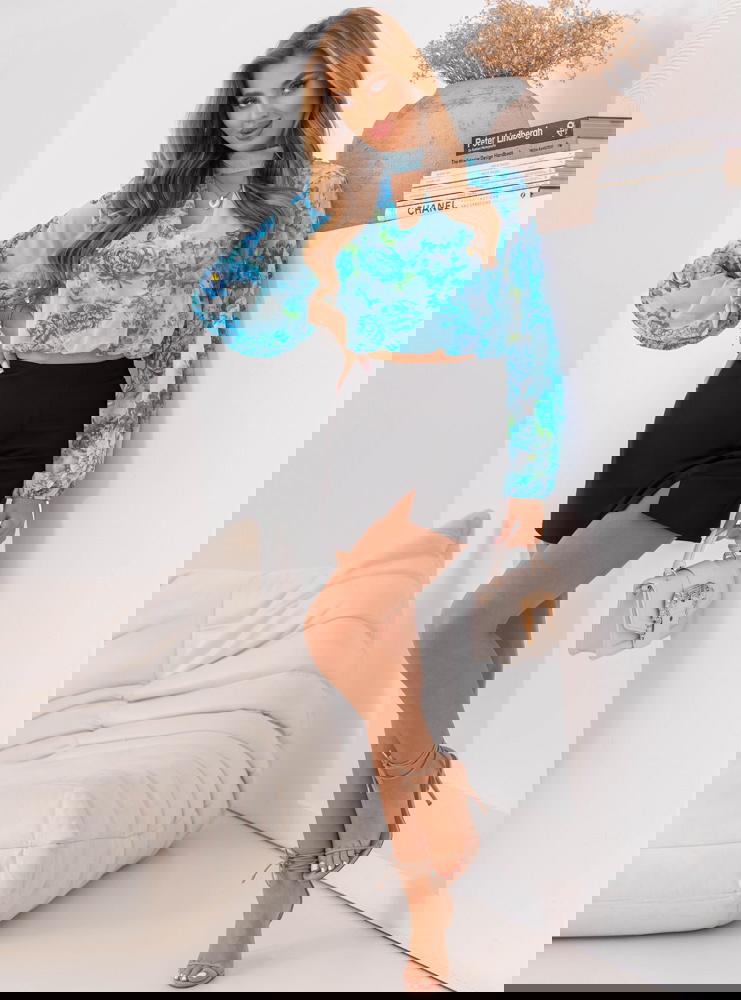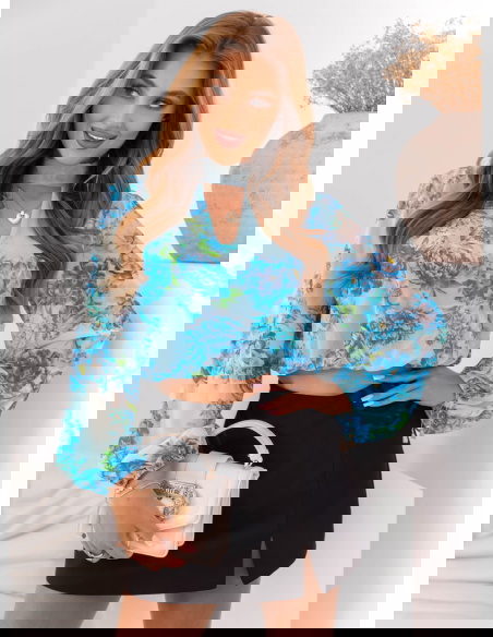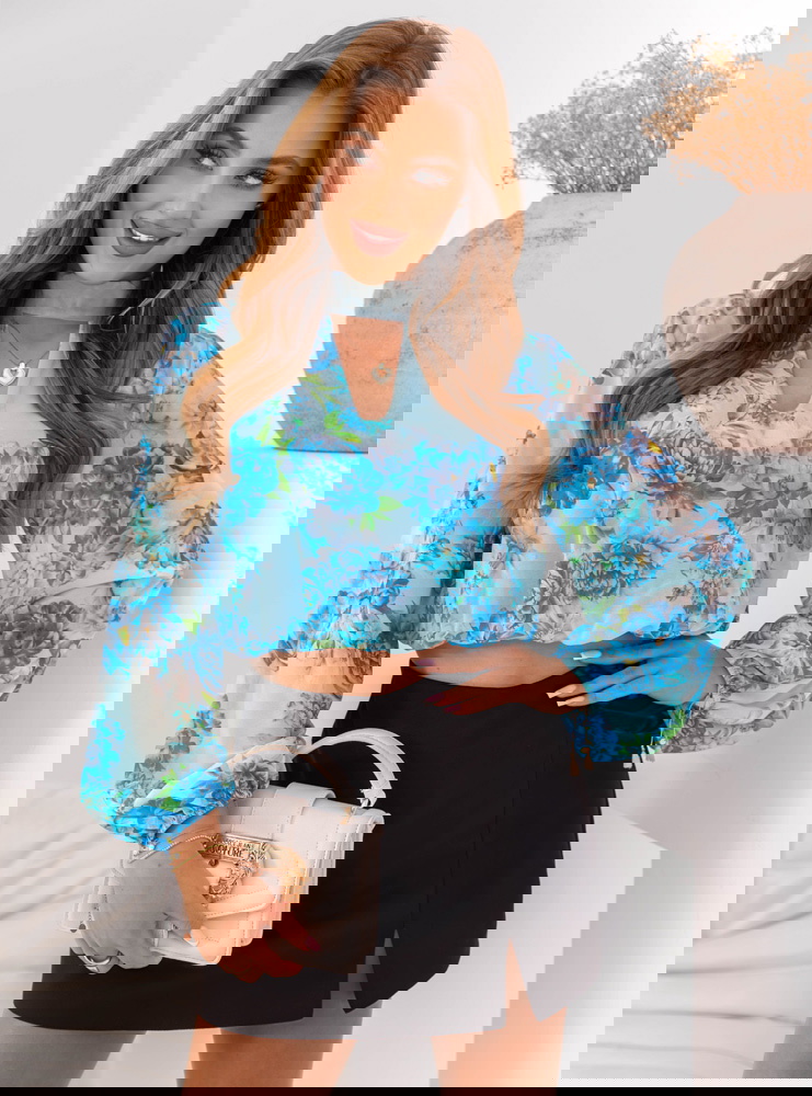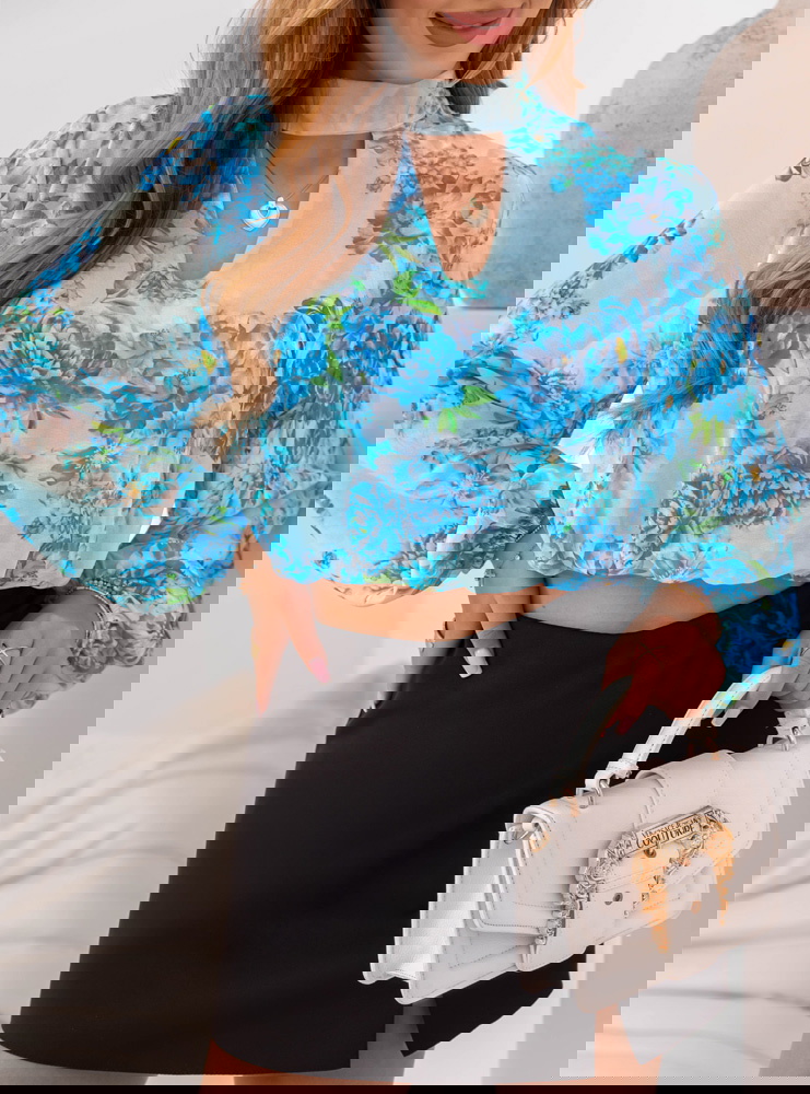Niebieska krótka bluzka w kwiaty Gorane może być noszona w codziennych stylizacjach z trampkami i jeansami lub w bardziej eleganckiej wersji z delikatnymi sandałkami i spódnicą midi.