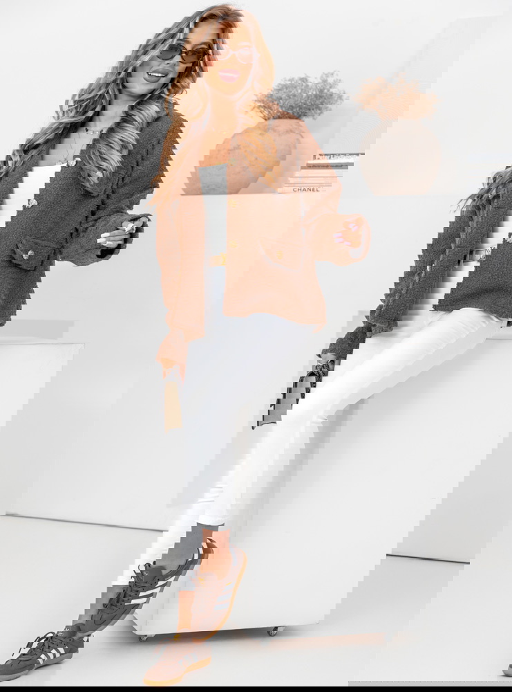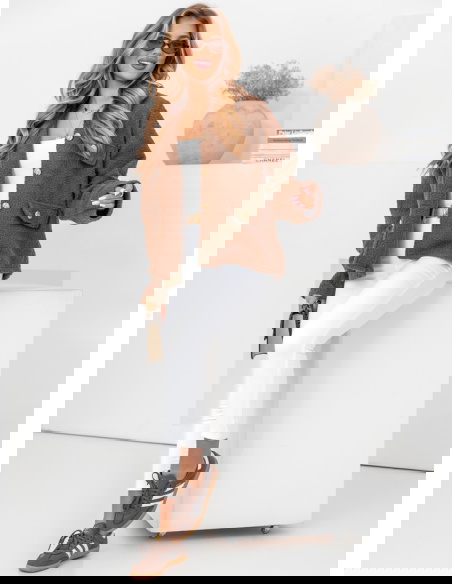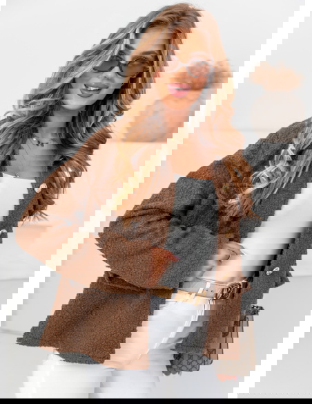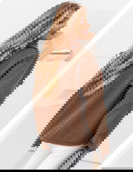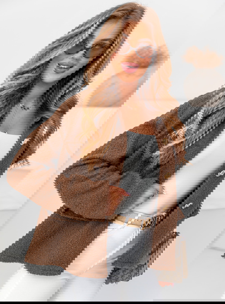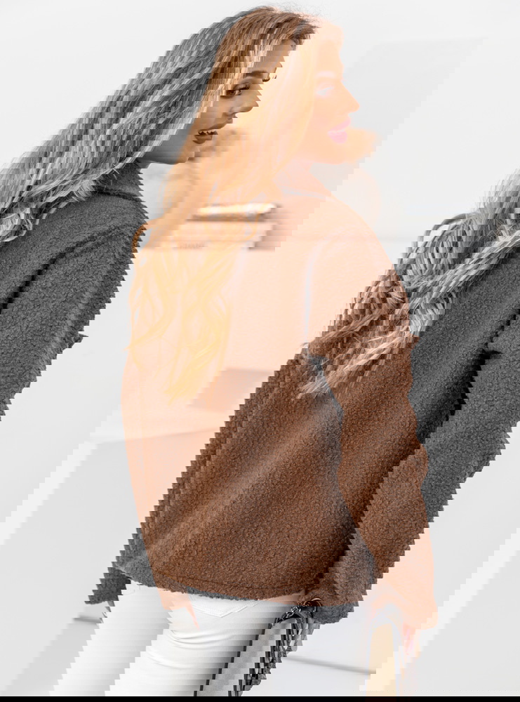 Czekoladowa kurtka typu teddy Morkino ma luźny, oversize’owy krój, co nie tylko dodaje stylu, ale także pozwala na swobodę ruchów i możliwość noszenia jej na grubsze swetry.