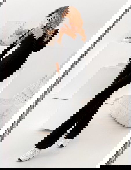 Czarny prążkowany kombinezon z wycięciem na plecach Earldene  można go łatwo stylizować, łącząc z eleganckimi szpilkami i biżuterią lub zestawiając z trampkami i ramoneską dla bardziej codziennego looku. Uniwersalna czerń sprawia, że jest to ponadczasowy element garderoby, który nigdy nie wychodzi z mody.
