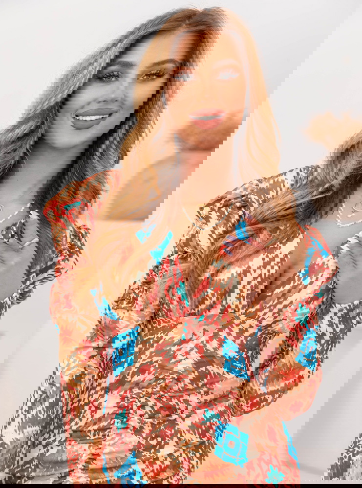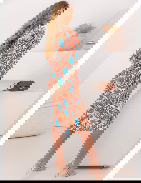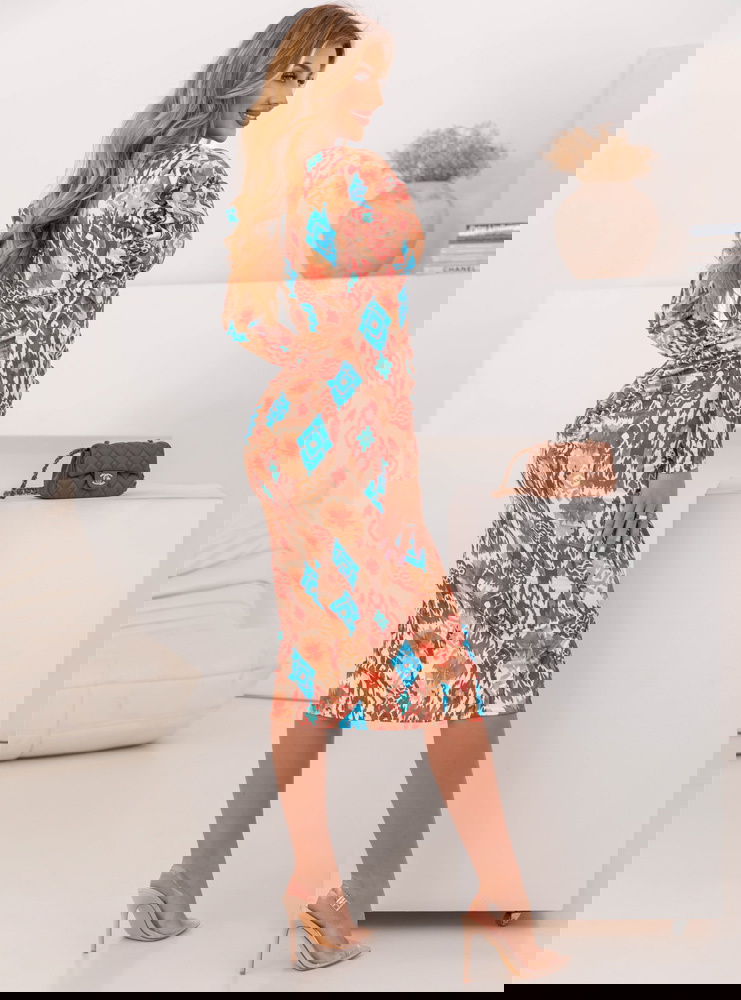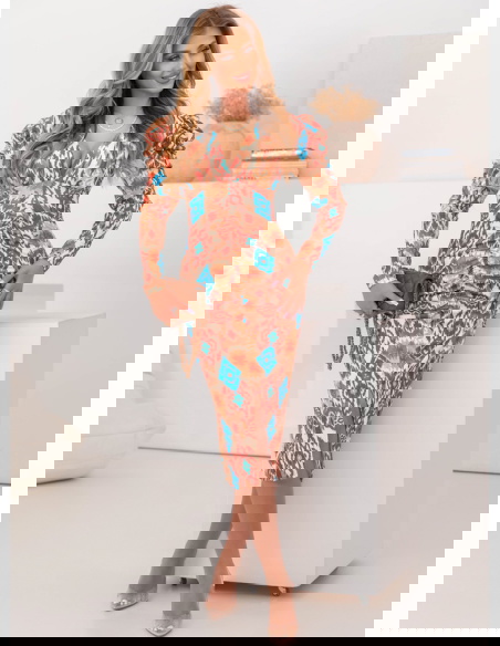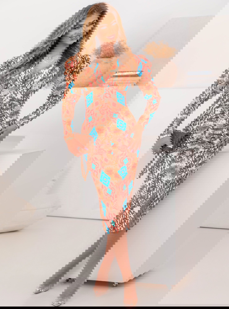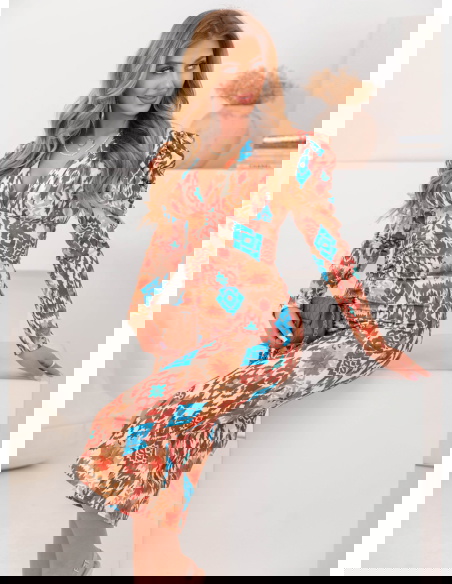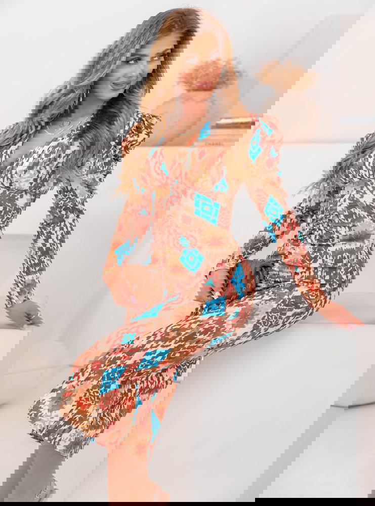 Wzorzysta dopasowana sukienka z rozcięciem Laqunda - wzór 4 to propozycja dla kobiet, które chcą podkreślić swoją figurę i wyróżnić się z tłumu. Jej efektowny wzór przyciąga wzrok i dodaje stylizacji charakteru. To idealny wybór dla osób, które lubią oryginalne i odważne fasony. Dopasowany krój podkreśla atuty sylwetki, a rozcięcie dodaje zmysłowego akcentu. Modne bufiaste rękawy nadają jej elegancji i wpisują się w aktualne trendy. Dekolt w literę „V” subtelnie eksponuje szyję i obojczyki, dodając sukience kobiecego wdzięku. Kolorystyka łączy ciepłe odcienie brązu z intensywnym błękitem, co sprawia, że całość prezentuje się wyjątkowo efektownie. Jest to model, który sprawdzi się zarówno na specjalne okazje, jak i na wieczorne wyjścia. Sukienka łączy elegancję z nutą egzotycznego stylu, co czyni ją wyjątkowym elementem garderoby. To propozycja dla kobiet, które chcą wyglądać stylowo i zmysłowo jednocześnie.