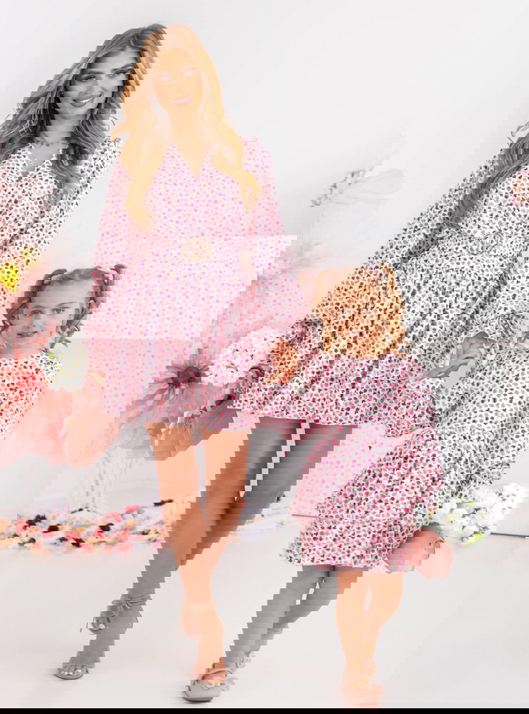 Zestaw sukienek w kwiatki mama i córka Carolyne - R1 to idealna propozycja na różnorodne okazje. Doskonale sprawdzi się na rodzinne uroczystości, takie jak chrzciny, wesela, komunie czy urodziny, gdzie mama i córka będą wyglądać zjawiskowo i harmonijnie.