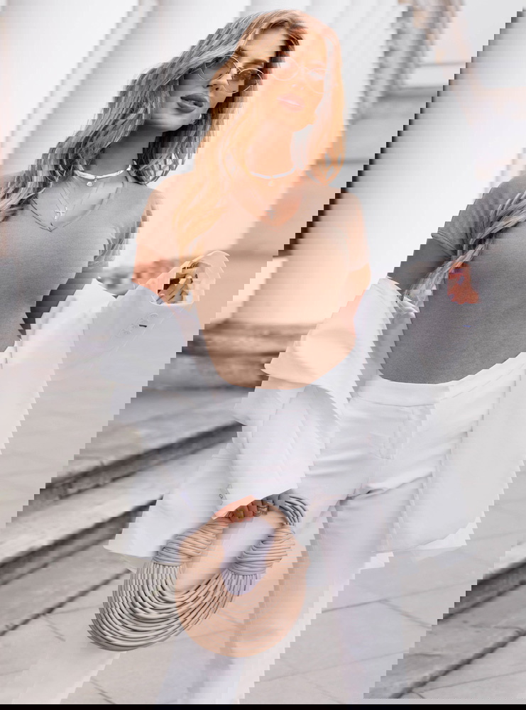 Koszulka z dekoltem w serek Lorrene - mocha mousse w połączeniu z eleganckimi dodatkami, takimi jak złota biżuteria czy apaszka, koszulka może zyskać bardziej luksusowy charakter, doskonale wpisując się w estetykę minimalizmu i ponadczasowej klasyki. Dekolt w serek optycznie wydłuża szyję, co jest szczególnie korzystne dla osób o niższym wzroście, ponieważ pomaga uzyskać efekt bardziej smukłej i proporcjonalnej sylwetki.