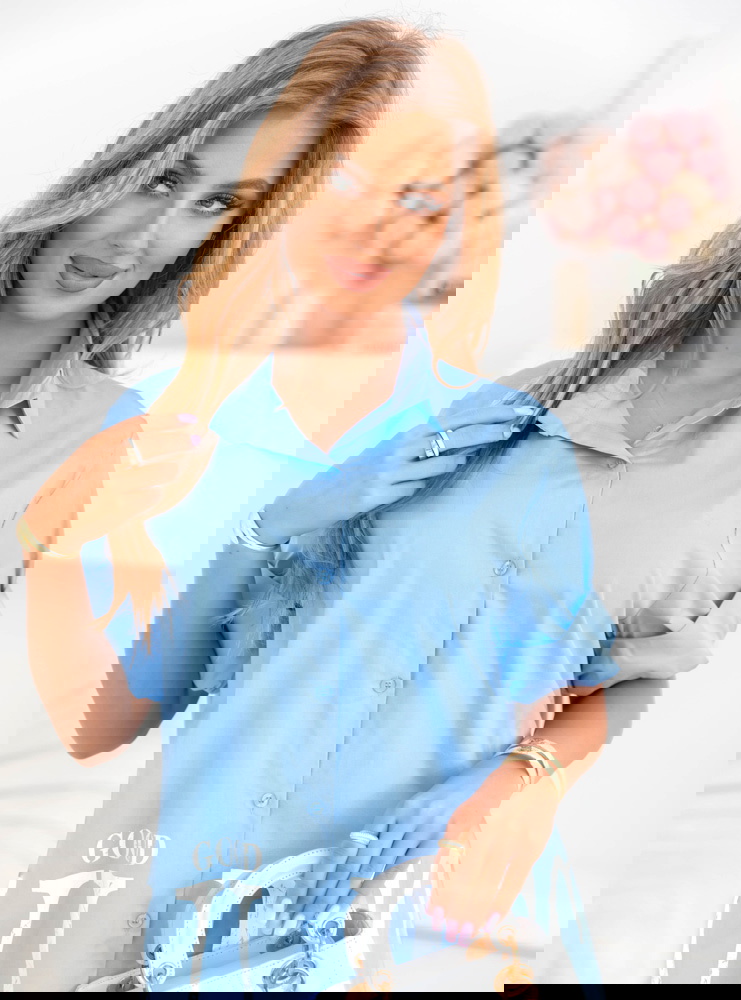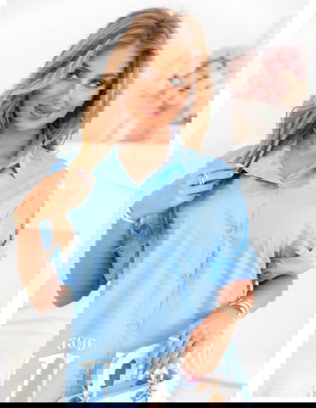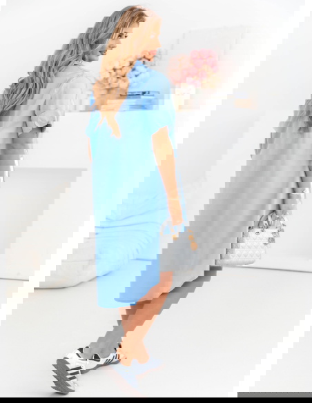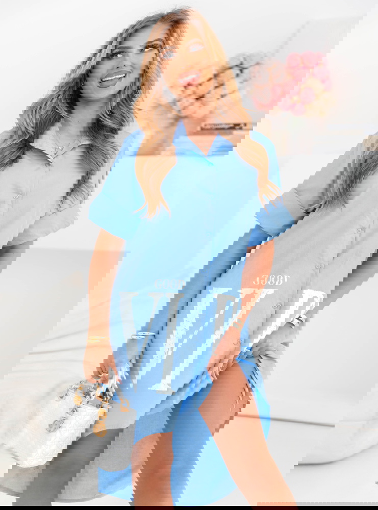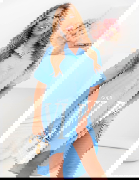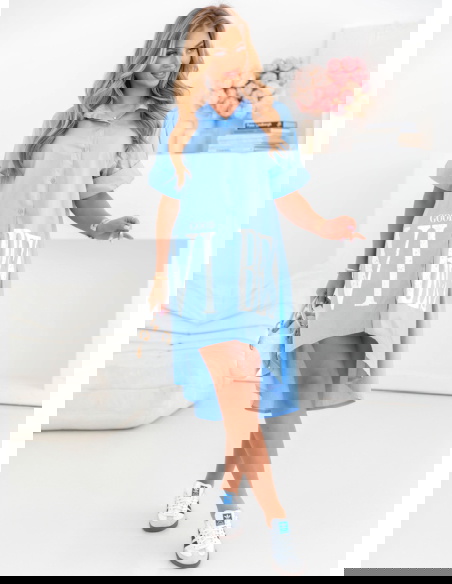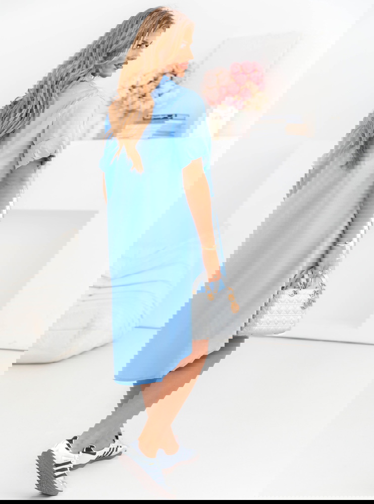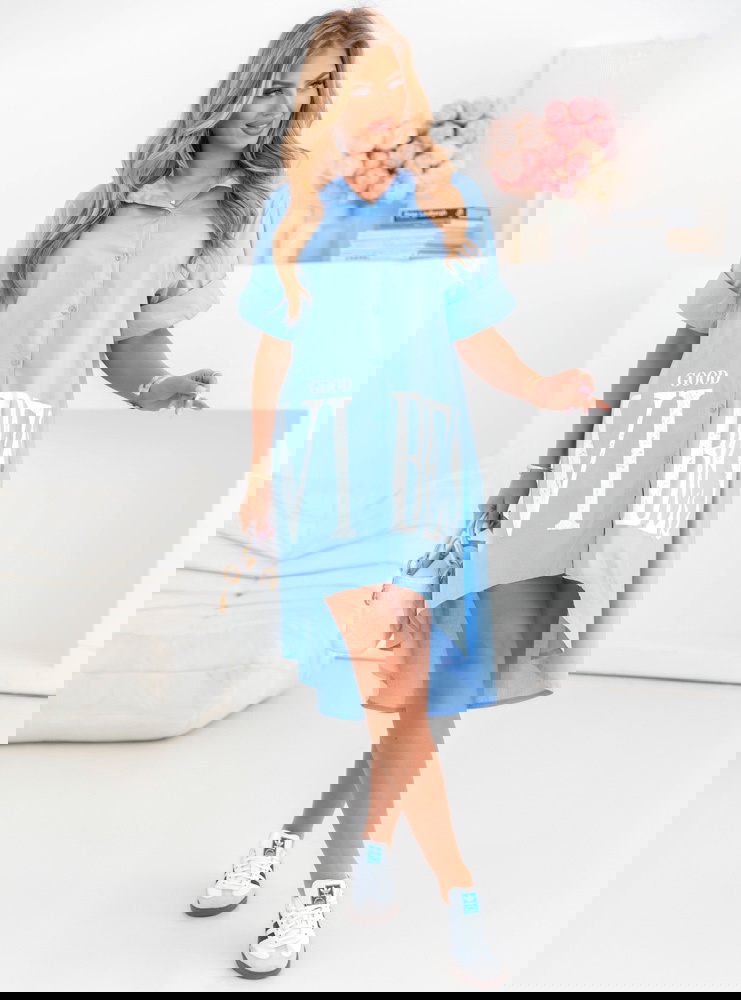 Błękitna asymetryczna sukienka koszulowa Sherilee to połączenie elegancji i swobodnego stylu. Błękit to kolor kojarzący się z lekkością, świeżością i spokojem, dlatego sukienka w tym odcieniu będzie idealnym wyborem na wiosenne i letnie dni. Koszulowy krój nadaje stylizacji klasycznego charakteru, a asymetryczny dół dodaje nowoczesności i lekkości. Zapięcie na guziki pozwala na łatwe dopasowanie sukienki do sylwetki, a wywijane rękawy nadają jej casualowego uroku. Napis „GOOD VIBES” w kontrastowym białym kolorze dodaje całości młodzieżowego, modnego akcentu. Luźny krój sprawia, że sukienka pięknie układa się na ciele, zapewniając komfort noszenia i swobodę ruchów. Asymetryczna długość sprawia, że stylizacja nabiera lekkości i oryginalności. Ta sukienka to idealna baza do wielu stylizacji – od casualowych po bardziej eleganckie. W połączeniu z dodatkami w kontrastowych kolorach możesz uzyskać ciekawy, modny efekt. Błękitna sukienka koszulowa to must-have w garderobie każdej kobiety, która ceni sobie styl i wygodę w jednym.