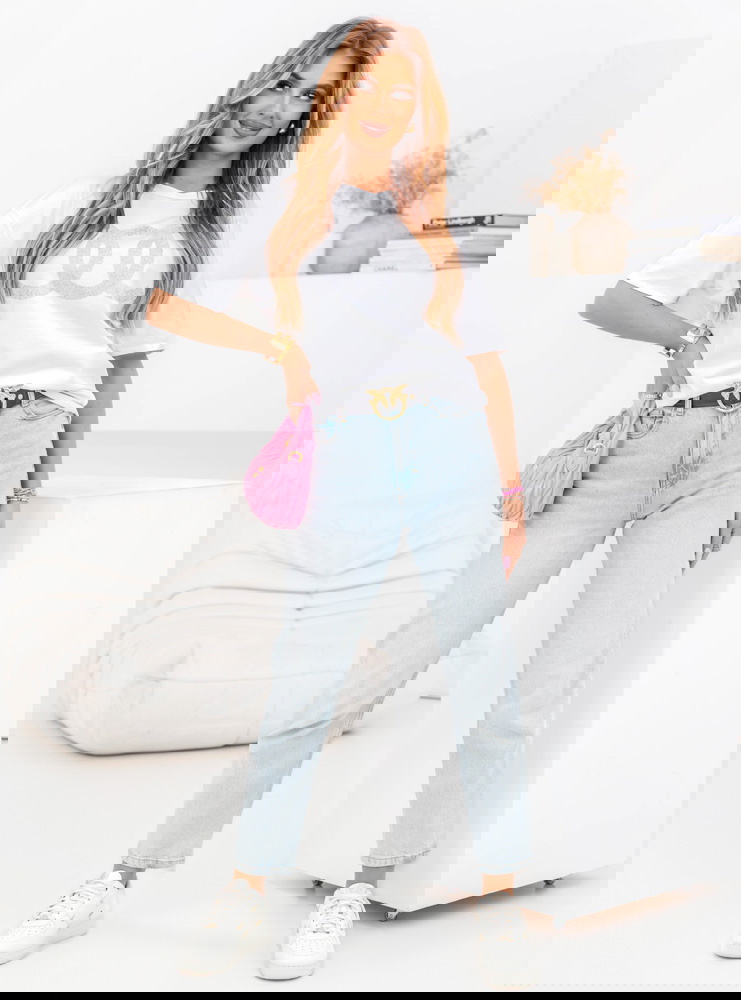 Biała koszulka z cyrkoniami Linalia to klasyka w nowoczesnym wydaniu. Luźny krój zapewnia wygodę i swobodę ruchów, a cyrkonie na froncie dodają stylizacji eleganckiego charakteru.