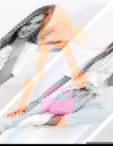 Biała koszulka z cyrkoniami Linalia to idealny wybór dla kobiet, które cenią sobie połączenie klasyki z subtelnym blaskiem. Biały kolor to ponadczasowa baza, która doskonale komponuje się z innymi elementami garderoby, tworząc spójne i stylowe stylizacje. Cyrkonie dodają koszulce elegancji i odrobiny luksusu, sprawiając, że nawet najprostsza stylizacja nabiera wyjątkowego charakteru. Koszulka ma luźny krój, który zapewnia wygodę i swobodę ruchów, jednocześnie podkreślając casualowy charakter stylizacji. To model, który z powodzeniem sprawdzi się zarówno na co dzień, jak i w bardziej eleganckich zestawieniach. Cyrkonie umieszczone na froncie tworzą efektowny wzór, który przyciąga spojrzenia i nadaje całości unikalnego wyglądu. Dzięki prostemu fasonowi koszulka pasuje do wielu elementów garderoby – jeansów, szortów, spódnic czy spodni materiałowych. To idealny element stylizacji, który łączy w sobie wygodę i modny, luksusowy akcent. Biała koszulka z cyrkoniami to świetny wybór na każdą okazję – od codziennych wyjść po bardziej eleganckie wydarzenia.