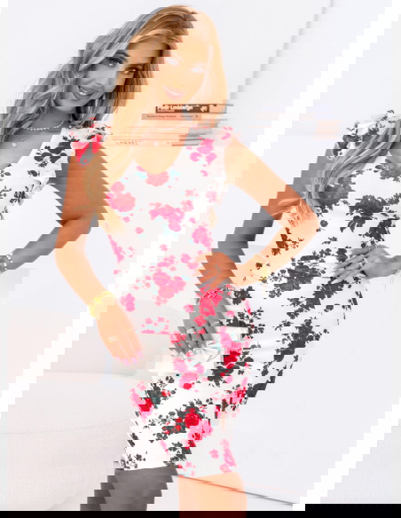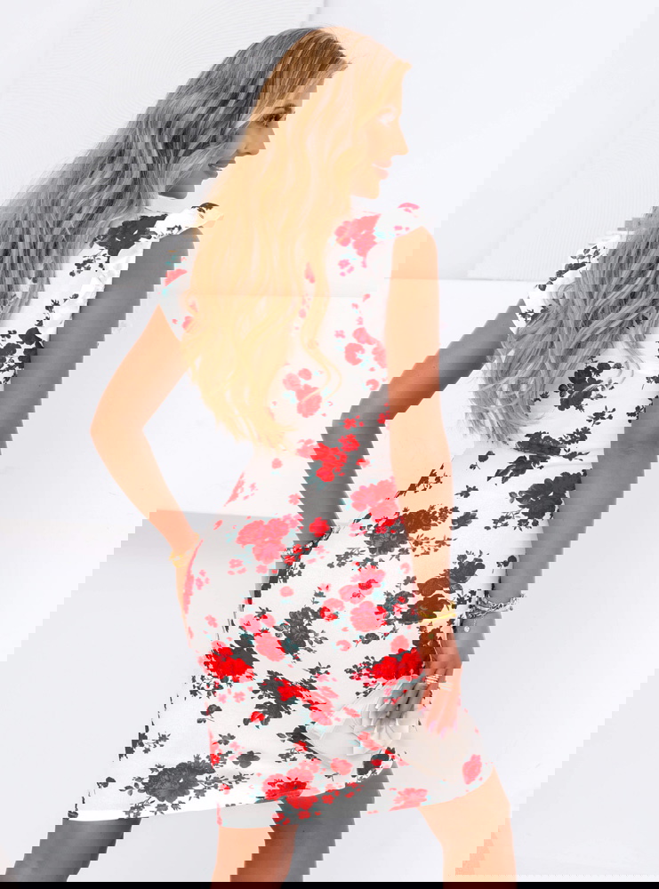 Wzorzysta sukienka z falbankami na rękawach Darlyne - N4 to wyjątkowo kobieca propozycja dla wszystkich miłośniczek subtelnych, a jednocześnie efektownych stylizacji. Już na pierwszy rzut oka przyciąga wzrok pięknym, kwiatowym wzorem w odcieniach czerwieni i zieleni, który zdobi białe tło. Jej krój jest dopasowany, dzięki czemu znakomicie podkreśla kobiece kształty i nadaje sylwetce smukłości. Urocze falbanki na rękawkach dodają dziewczęcego uroku i lekkości, tworząc romantyczny klimat. Dekolt w kształcie serca subtelnie eksponuje ramiona i szyję, optycznie je wydłużając. Sukienka sięga lekko przed kolano, co czyni ją bardzo uniwersalną, a jednocześnie odpowiednią na wiele okazji. Delikatne rozcięcie z przodu dodaje charakteru i seksapilu, nie odsłaniając zbyt wiele. To idealna opcja dla kobiet, które chcą wyglądać świeżo, elegancko i z klasą. Stylizacja z taką sukienką nie wymaga wielu dodatków – sama w sobie robi ogromne wrażenie. Zdecydowanie wyróżnia się na tle klasycznych modeli i z łatwością przyciąga spojrzenia.
