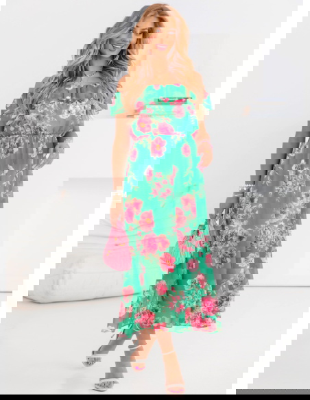 Wzorzysta sukienka typu hiszpanka Chantae - wzór 2 to idealna propozycja dla kobiet, które kochają romantyczne, kobiece i efektowne stylizacje. Ten model przyciąga uwagę już od pierwszego spojrzenia – dzięki intensywnym kolorom, kwiatowym wzorom i zmysłowemu fasonowi. Odsłonięte ramiona w stylu hiszpańskim dodają subtelności i lekkości, sprawiając, że całość wygląda niezwykle wdzięcznie. Sukienka ta doskonale sprawdzi się w ciepłe dni – jest przewiewna, wygodna i bardzo stylowa. Dzięki swojej długości do połowy łydki prezentuje się elegancko, ale z zachowaniem swobody i wakacyjnego klimatu. Gumka w pasie pięknie podkreśla talię, a luźny dół nadaje sylwetce lekkości i wdzięku. Motyw kwiatowy na zielonym tle przywołuje letnie skojarzenia i wpisuje się w aktualne trendy. To sukienka, która doskonale łączy kobiecy urok z wyrazistym charakterem. Jeśli lubisz wyróżniać się z tłumu i stawiać na wygodę połączoną z modą – ten model jest właśnie dla Ciebie.