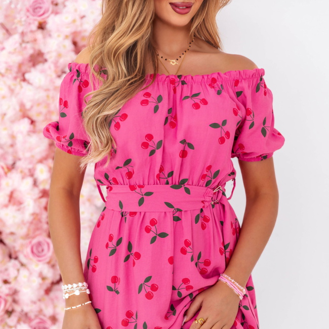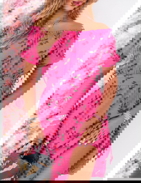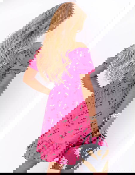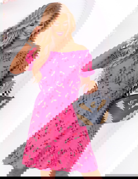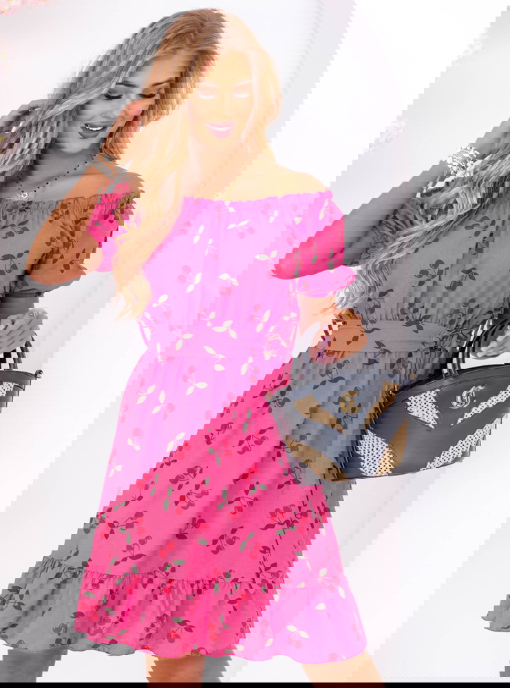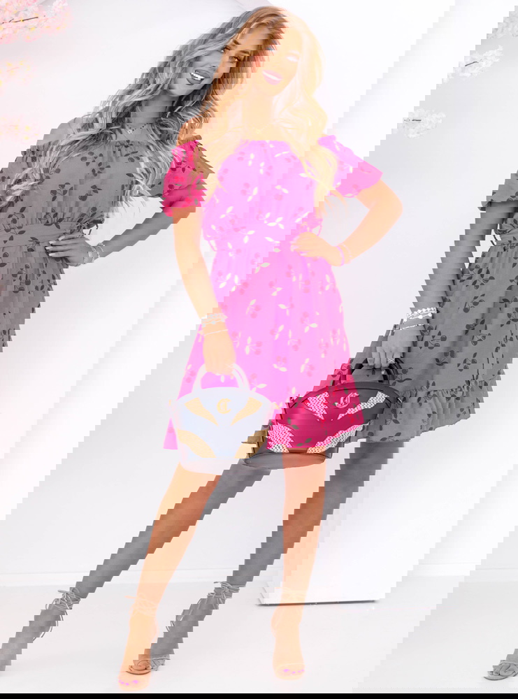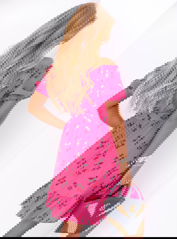 Różowa sukienka mini typu hiszpanka Melena to uosobienie dziewczęcego wdzięku, letniej świeżości i subtelnej kokieterii. Jej soczysty kolor przyciąga spojrzenia, a fason z odkrytymi ramionami dodaje stylizacji lekkości i zmysłowości. Hiszpański dekolt pięknie eksponuje szyję i ramiona, wprowadzając romantyczny klimat, idealny na ciepłe dni. Krótkie rękawki z lekką bufką oraz delikatna falbana przy dolnej krawędzi podkreślają kobiecy charakter sukienki. Wzór w urocze wisienki nadaje całości zabawnego, letniego stylu, który idealnie wpisuje się w wakacyjny nastrój. Sukienka ma długość mini i lekko rozkloszowany dół, co sprawia, że pięknie układa się w ruchu i świetnie podkreśla nogi. Wiązanie w talii pozwala dopasować krój do sylwetki i ładnie zaakcentować wcięcie w pasie. To idealny wybór dla kobiet, które chcą poczuć się swobodnie, ale jednocześnie wyglądać efektownie i stylowo. Świetnie łączy w sobie wygodę, dziewczęcość i świeży, wakacyjny klimat. Taka sukienka to strzał w dziesiątkę na lato!