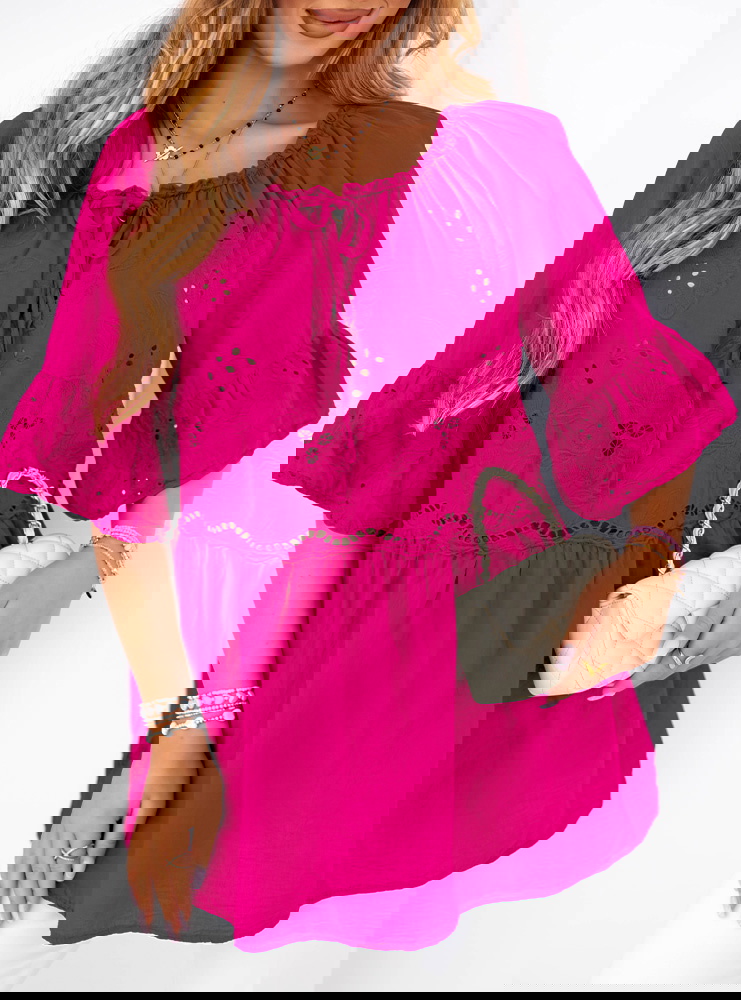 Ażurowa bluzka z wiązaniem Erdine - fuksja to esencja kobiecego stylu w letnim, lekkim wydaniu. Jej soczysty kolor natychmiast przyciąga spojrzenia i dodaje energii każdej stylizacji. Ażurowe wykończenia z kwiatowymi motywami wprowadzają romantyczny klimat i delikatność. Fason z wiązaniem przy dekolcie pozwala dopasować bluzkę do swoich preferencji – możesz nosić ją swobodnie lub z lekkim dekoltem. Falbanki na rękawach dodają dziewczęcego uroku, a lekko rozszerzany krój zapewnia komfort i swobodę ruchów. To model, który sprawdzi się zarówno w codziennych stylizacjach, jak i na bardziej wyjątkowe okazje. Idealnie pasuje do jeansów, białych spodni, szortów czy spódnic. Ażurowa struktura nadaje całości lekkości i przewiewności, co czyni tę bluzkę świetnym wyborem na cieplejsze dni. To ubranie, które łączy wygodę z wyjątkowym stylem. Jeśli szukasz bluzki, która podkreśli Twoją kobiecość i doda stylizacji charakteru – właśnie ją znalazłaś.
