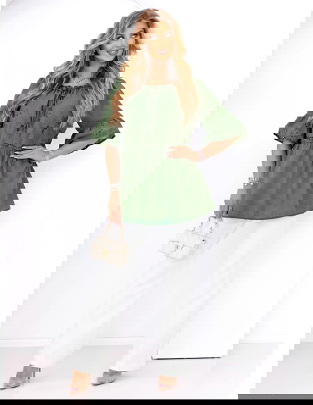 Ażurowa bluzka z wiązaniem Erdine - khaki to wyjątkowo kobieca i komfortowa propozycja, która świetnie sprawdzi się w codziennych i letnich stylizacjach. Jej lekki, swobodny krój gwarantuje wygodę przez cały dzień, a delikatne ażurowe zdobienia nadają romantycznego charakteru. Subtelne detale w postaci haftów i wycięć pięknie zdobią całość, tworząc stylową, ale nieprzytłaczającą kompozycję. Wiązanie przy dekolcie pozwala regulować głębokość wycięcia, dzięki czemu sama decydujesz, jak ją nosić. Rękawy 3/4 z falbanką dodają bluzce dziewczęcego uroku, jednocześnie sprawiając, że jest idealna na cieplejsze dni. Kolor khaki to strzał w dziesiątkę – stonowany, naturalny, a jednocześnie pasujący do wielu innych barw. Bluzka świetnie komponuje się z jasnymi spodniami, jeansami czy szortami. Jest wygodna, lekka i przewiewna – doskonała na lato i sezon przejściowy. To model, po który sięga się chętnie – i to nie tylko raz. Jeśli szukasz czegoś stylowego, ale praktycznego – ta bluzka będzie idealna.