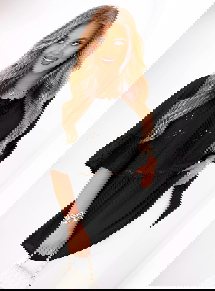 Czarna ażurowa bluzka z wiązaniem Erdine to must-have w każdej kobiecej szafie. Uniwersalna, kobieca, wygodna i z charakterem – idealna na wiele okazji.