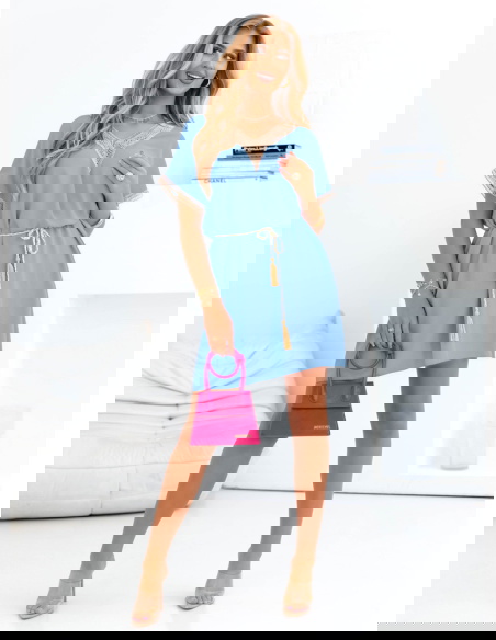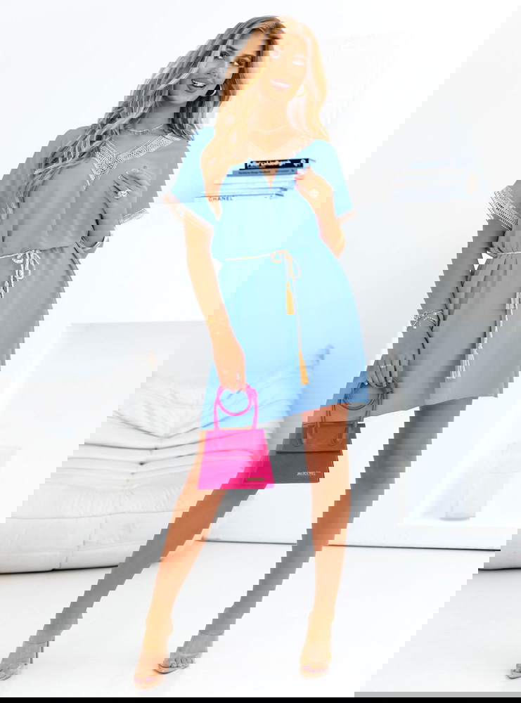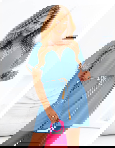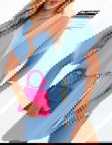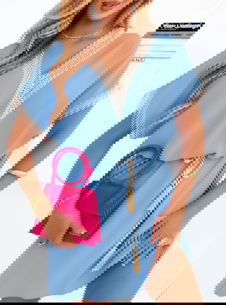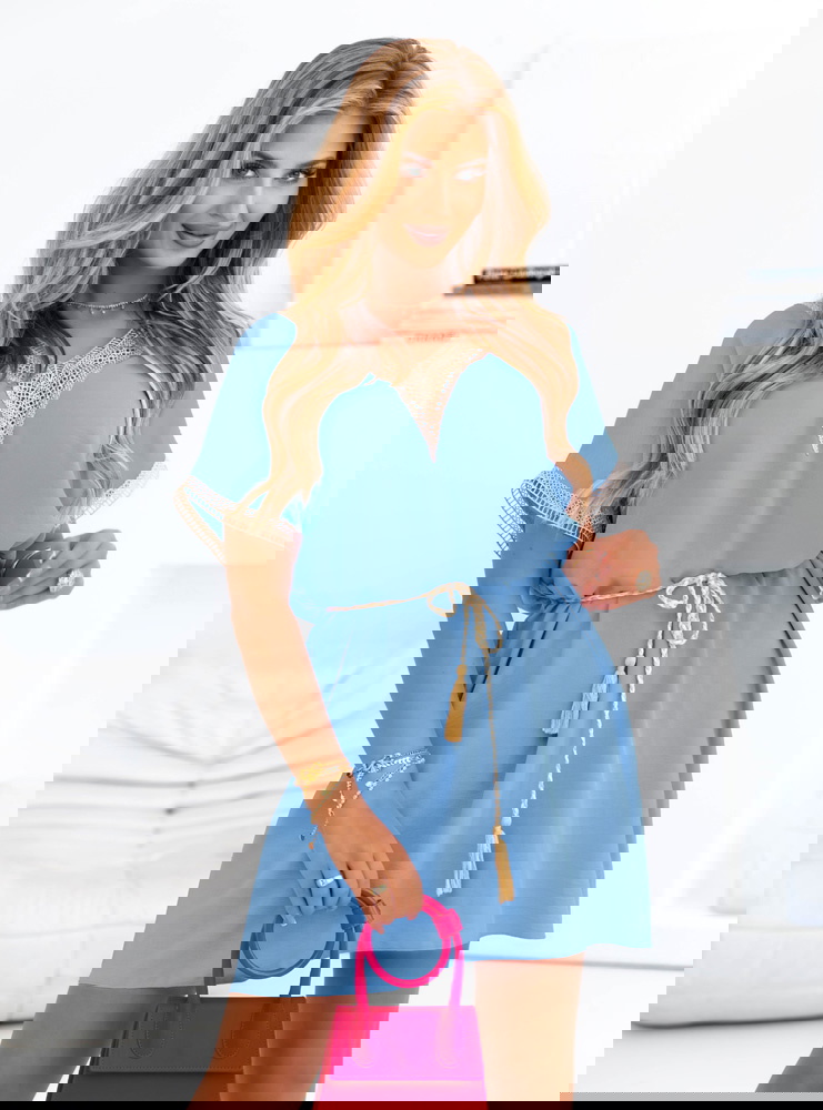 Błękitna sukienka mini z koronką Mevelyn to propozycja, która zachwyca już od pierwszego spojrzenia. Jej kolor przywodzi na myśl bezchmurne niebo i letnią świeżość. To sukienka, która sprawia, że czujesz się lekko, swobodnie i stylowo. Dzięki kobiecemu krojowi i subtelnym detalom przyciąga uwagę, nie dominując całej stylizacji. Idealnie podkreśla urodę i dodaje pewności siebie. Koronkowe akcenty przy dekolcie i rękawach nadają jej elegancji, a sznurek w talii pozwala dopasować ją do sylwetki. To doskonały wybór na ciepłe dni, kiedy zależy Ci na wygodzie i dobrym wyglądzie. Sukienka wpisuje się w aktualne trendy, ale pozostaje ponadczasowa. Jest lekka, przewiewna i pełna uroku. Jeśli szukasz czegoś kobiecego, ale niezobowiązującego – to model stworzony dla Ciebie.