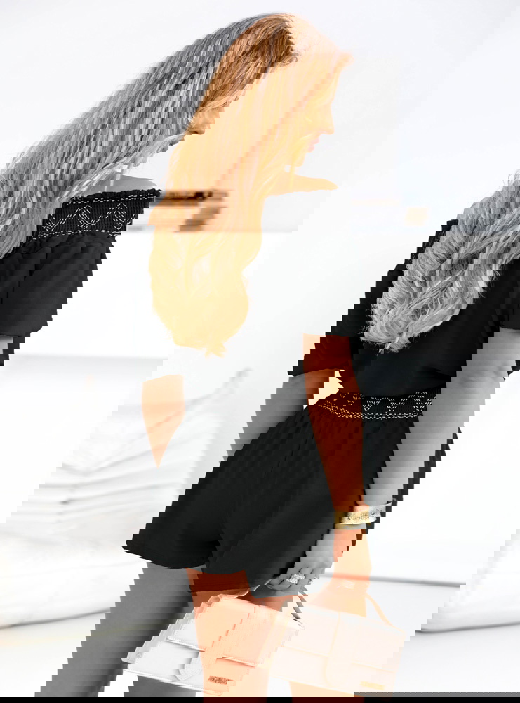 Czarny komplet bluzka typu hiszpanka i spodenki Teressita to idealna propozycja dla kobiet, które uwielbiają wygodę połączoną z nutą zmysłowości. Jego wyjątkowy krój sprawia, że stylizacja wygląda lekko, kobieco i bardzo nowocześnie. Bluzka typu hiszpanka pięknie eksponuje ramiona, dodając całości subtelnej elegancji. Drobne detale i ozdobne przeszycia w pasie oraz przy dekolcie sprawiają, że zestaw prezentuje się niezwykle stylowo. Spodenki z wysokim stanem podkreślają talię i nadają sylwetce proporcji, a zarazem zapewniają komfort noszenia. To komplet, który możesz stylizować na wiele sposobów – z dodatkami w wersji eleganckiej lub casualowej. Czarny kolor sprawia, że całość wygląda klasycznie, ale nie nudno. Doskonale odnajdzie się w miejskim stylu, ale też na letnich wyjazdach. To zestaw, który świetnie wpisuje się w trendy, nie rezygnując przy tym z wygody. Jeśli lubisz kobiece, ale praktyczne rozwiązania – ten komplet będzie strzałem w dziesiątkę.