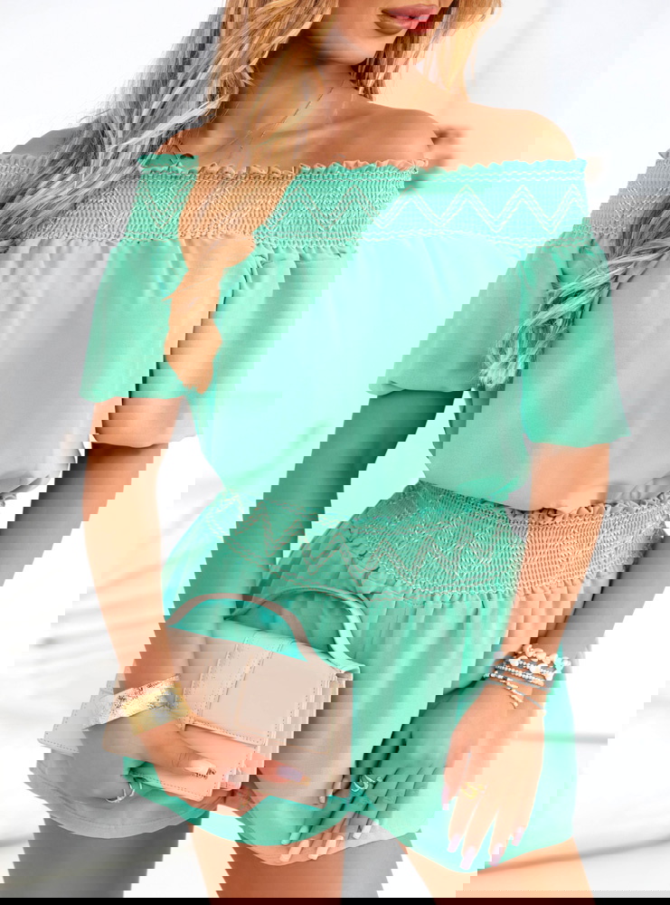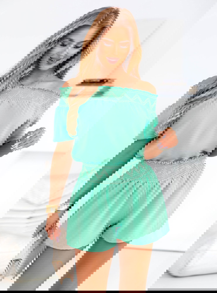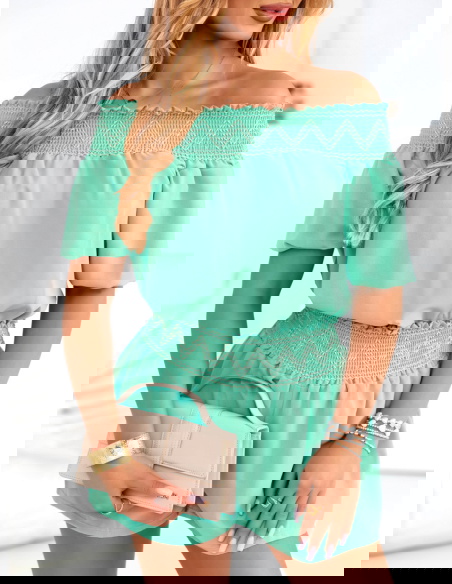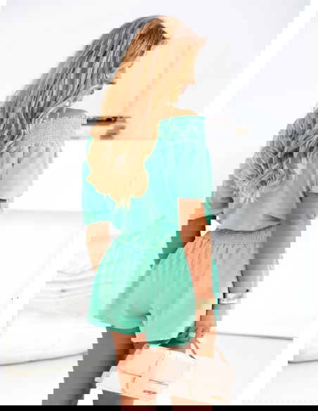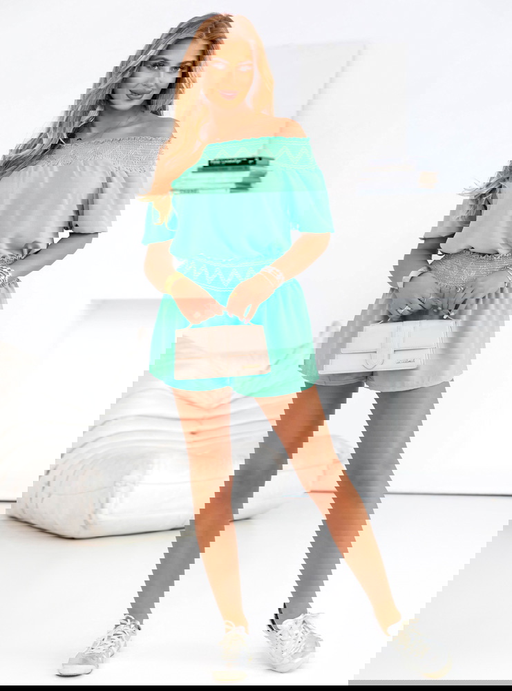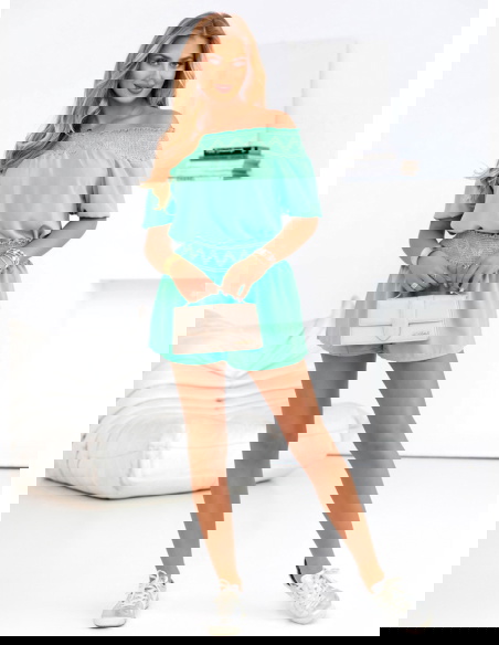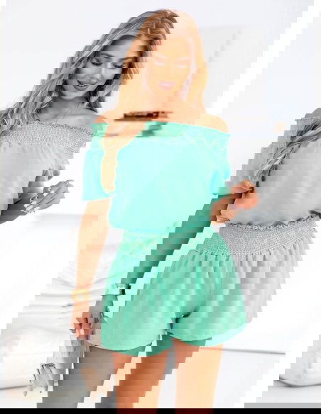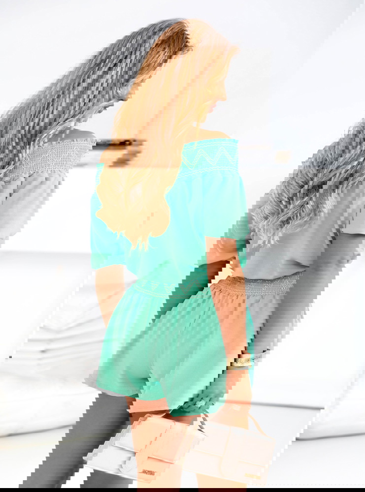 Miętowy komplet bluzka typu hiszpanka i spodenki Teressita