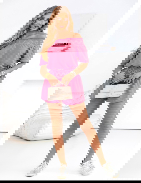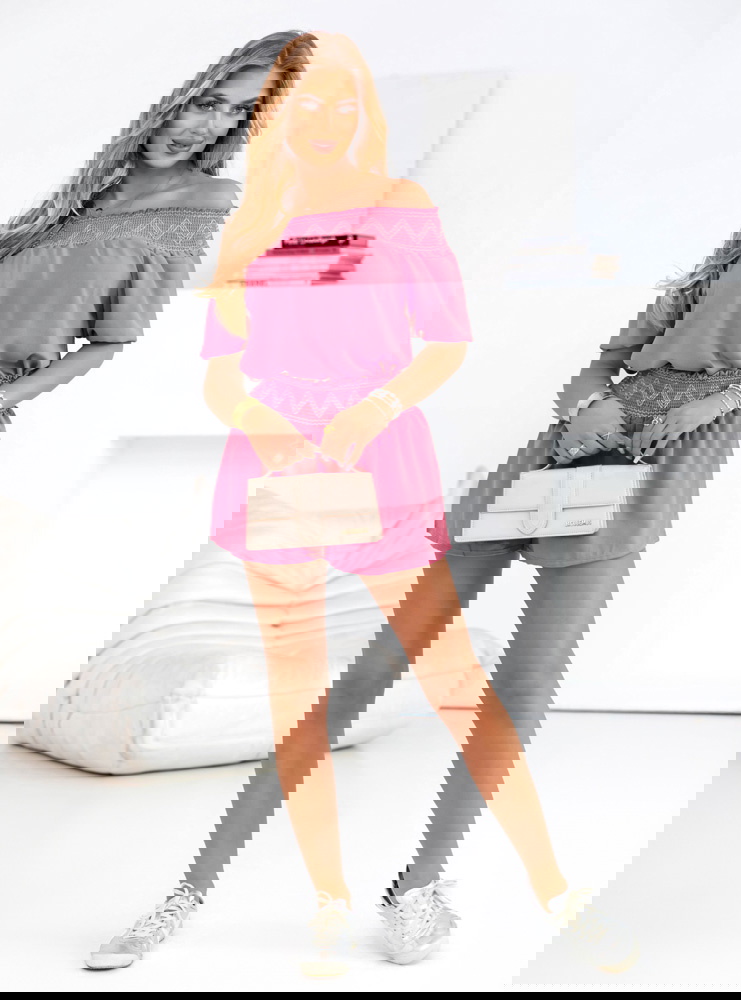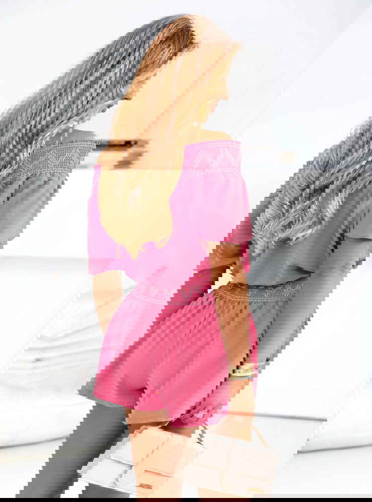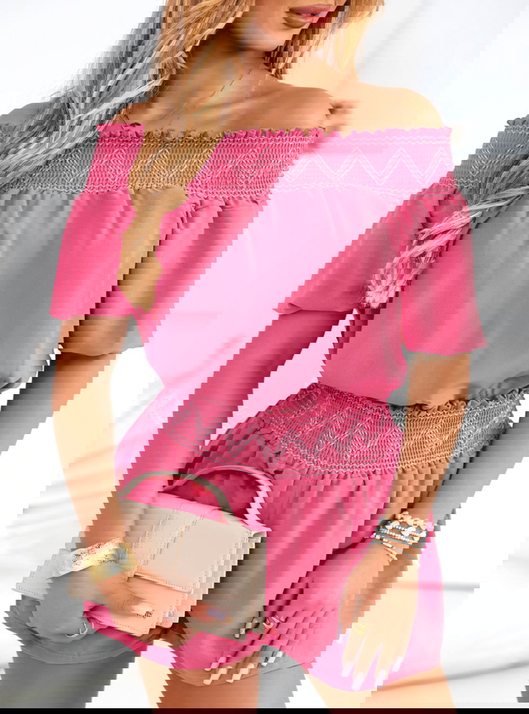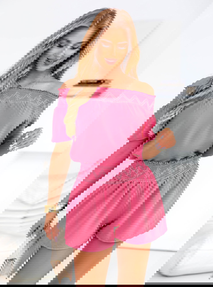 Różowy komplet bluzka typu hiszpanka i spodenki Teressita to pełna uroku propozycja dla kobiet, które lubią wyróżniać się kolorem i kobiecym stylem. Wyrazisty odcień różu natychmiast przyciąga wzrok, a jednocześnie dodaje energii całej stylizacji. Ten komplet łączy wygodę z modnym wyglądem, dzięki czemu sprawdzi się zarówno na co dzień, jak i w bardziej wyjątkowych sytuacjach. Dekolt typu hiszpanka subtelnie odsłania ramiona, podkreślając letni, romantyczny charakter zestawu. Zarówno bluzka, jak i spodenki ozdobione są haftem w geometryczny wzór, który nadaje całości charakterystycznego sznytu. Elastyczna talia i luźny fason sprawiają, że komplet pięknie układa się na sylwetce i zapewnia maksymalny komfort noszenia. Stylowy, ale nienachalny – idealny, by poczuć się kobieco i swobodnie. To zestaw, w którym nie musisz się martwić o dodatki – sam w sobie robi wrażenie. Świetny wybór na dni, kiedy chcesz wyglądać świetnie bez nadmiernego wysiłku.