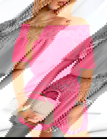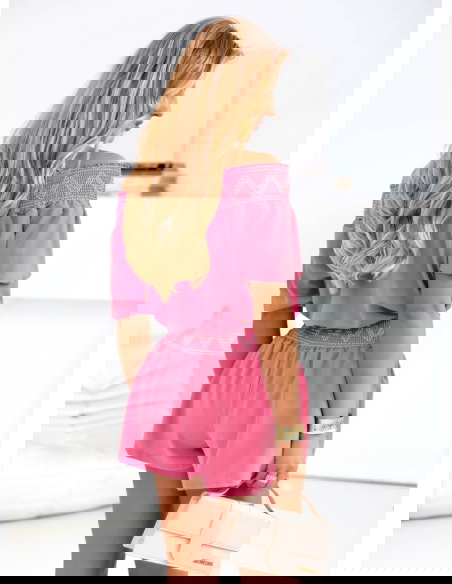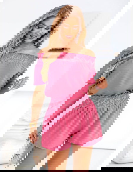 Różowy komplet bluzka typu hiszpanka i spodenki Teressita