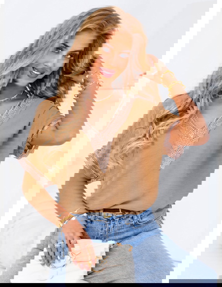 Bluzka z dekoltem w serek Naliciia - mocha mousse to idealna bluzka do codziennych stylizacji – do pracy, na zakupy, czy spotkanie z przyjaciółką. Świetnie nadaje się na bardziej casualowe wyjścia, jak brunch czy spacer po mieście.