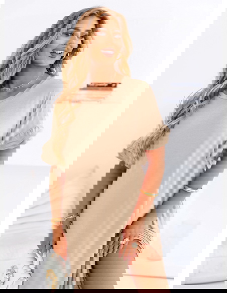 Beżowa sukienka oversize z falbanami na rękawach Julialy to idealna propozycja dla kobiet, które szukają połączenia swobody, stylu i uniwersalności w jednym. Jej luźny krój zapewnia pełen komfort, a jednocześnie wygląda niezwykle nowocześnie i kobieco. Beżowy kolor to ponadczasowa klasyka – pasuje do wszystkiego i świetnie sprawdza się przez cały rok. Sukienka pięknie układa się na sylwetce, nie opinając ciała, co daje przyjemne uczucie lekkości i swobody. Rękawy zakończone subtelnymi falbanami dodają całości uroku i tworzą ciekawy, dziewczęcy akcent. To doskonały model dla każdej figury – świetnie maskuje to, co trzeba, a jednocześnie podkreśla atuty. Można ją nosić solo lub zestawiać z paskiem, jeśli chcesz zaakcentować talię. Jej długość midi jest bardzo uniwersalna – odpowiednia zarówno na co dzień, jak i na bardziej eleganckie okazje. To sukienka, którą po prostu zakładasz i wyglądasz świetnie, bez zbędnego kombinowania. Jeśli cenisz minimalizm z nutką romantyzmu, ta propozycja będzie strzałem w dziesiątkę.
