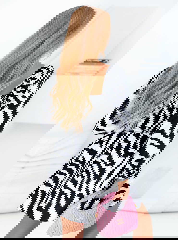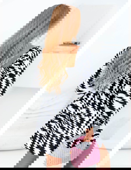 Sukienka mini z bufiastymi rękawami Joseli - wzór 1 to stylowa, odważna i niezwykle kobieca propozycja, która nie pozostanie niezauważona. Wyrazisty czarno-biały print inspirowany motywem zebry nadaje całości wyjątkowego, modowego charakteru. Sukienka ma efektowny fason z podkreśloną talią i rozkloszowanym dołem, który pięknie układa się podczas ruchu. Długość mini eksponuje nogi, dodając sylwetce lekkości i energii. Bufiaste rękawy nadają całości teatralnego, ale wciąż bardzo kobiecego wyglądu, podkreślając ramiona i dodając objętości w stylu glamour. Góra z marszczeniem i dekoltem w stylu karo przyciąga spojrzenia, eksponując linię szyi i obojczyków. To sukienka, która mówi sama za siebie – wystarczy jeden element, by stworzyć kompletny look. Idealna na imprezę, randkę, a także wtedy, gdy chcesz poczuć się wyjątkowo. Z tą sukienką nie musisz sięgać po mocne dodatki – ona gra pierwsze skrzypce.