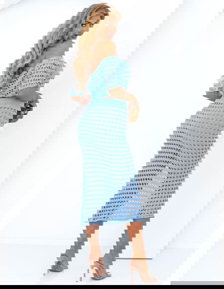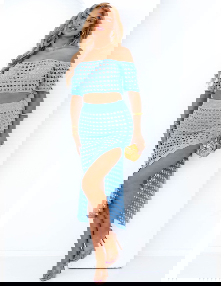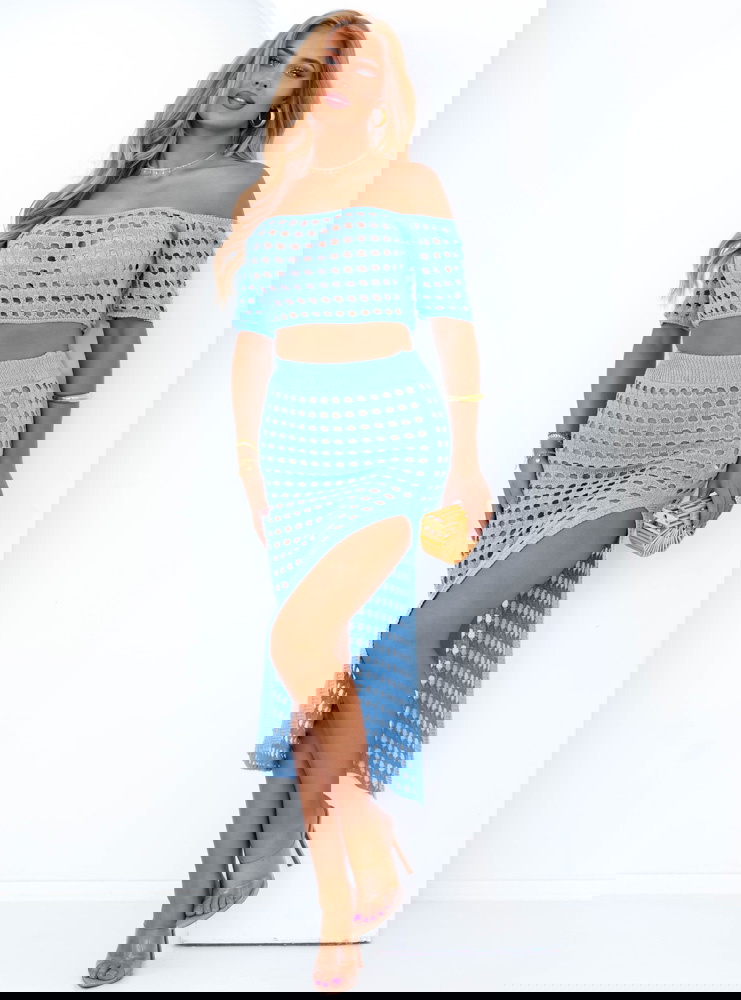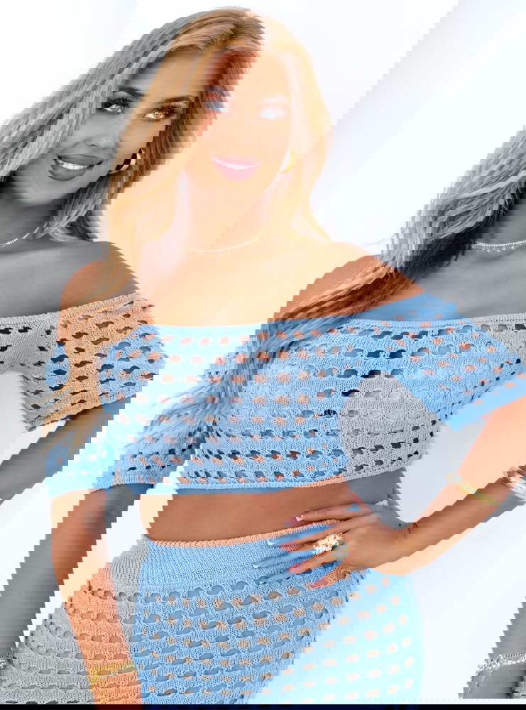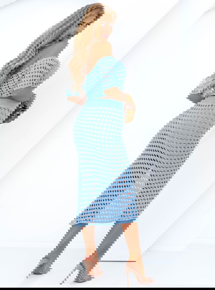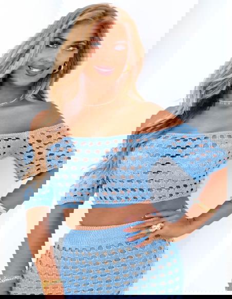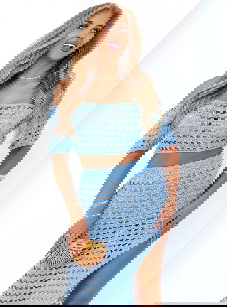 Błękitny komplet ażurowy top+spódnica Werilla to modowa perełka, która idealnie wpisuje się w wakacyjny, kobiecy styl. Subtelny odcień błękitu pięknie podkreśla opaleniznę i przyciąga spojrzenia swoją świeżością. Komplet składa się z krótkiego topu typu hiszpanka oraz dopasowanej spódnicy z wysokim stanem i efektownym rozcięciem. Ażurowa struktura nadaje całości lekkości i letniego charakteru, a zarazem dodaje oryginalności i uroku. To zestaw, który podkreśla kobiecą sylwetkę, eksponując ramiona, talię i nogi w bardzo stylowy, ale nienachalny sposób. Idealny na gorące dni – przewiewny, lekki i niezwykle komfortowy. Sprawdzi się zarówno podczas plażowych spacerów, jak i wieczornego wyjścia na wakacjach. Możesz nosić oba elementy razem lub osobno – dając sobie jeszcze więcej możliwości stylizacyjnych. Jeśli marzysz o wyjątkowym, wakacyjnym looku, który wyróżni Cię z tłumu – ten komplet jest stworzony właśnie dla Ciebie.