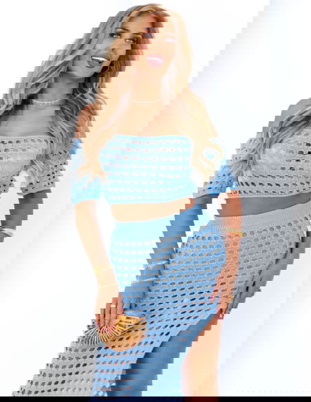 Błękitny komplet ażurowy top+spódnica Werilla to zestaw stworzony na lato – doskonały na wakacje, plażę, spacer nad morzem czy letnią imprezę. Sprawdzi się także na festiwalach, garden party i luźnych spotkaniach z przyjaciółmi.