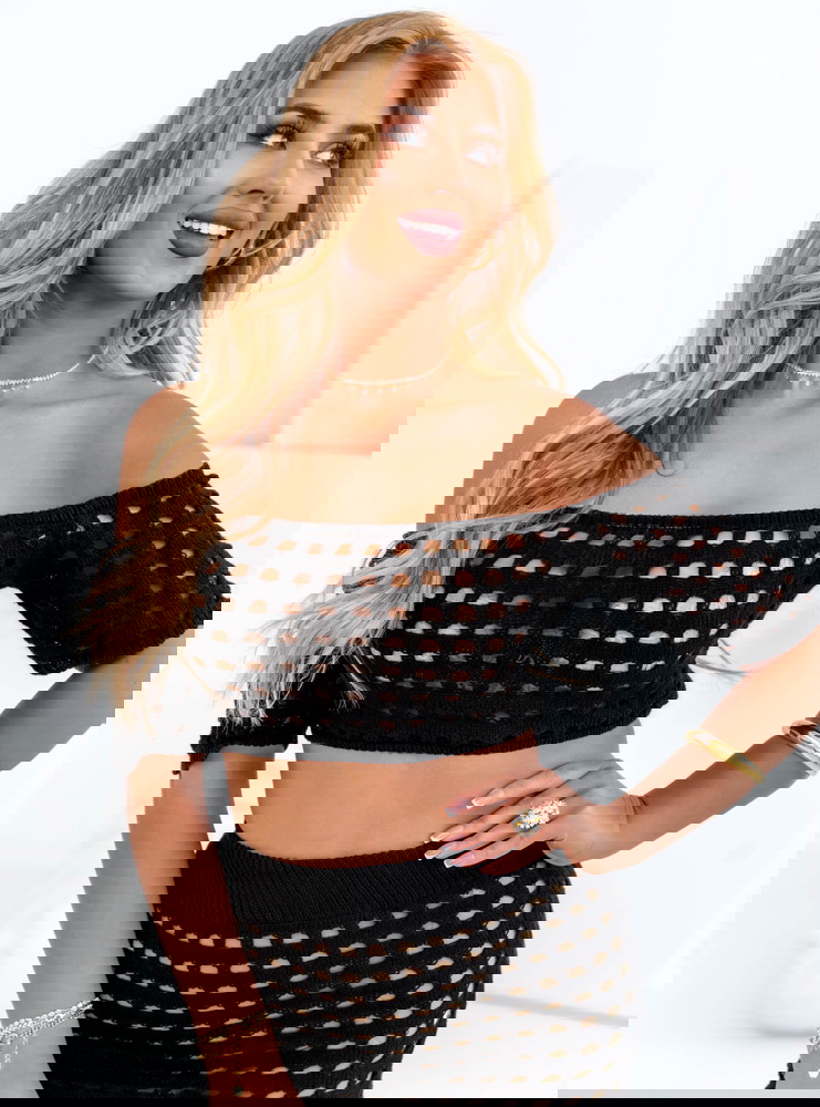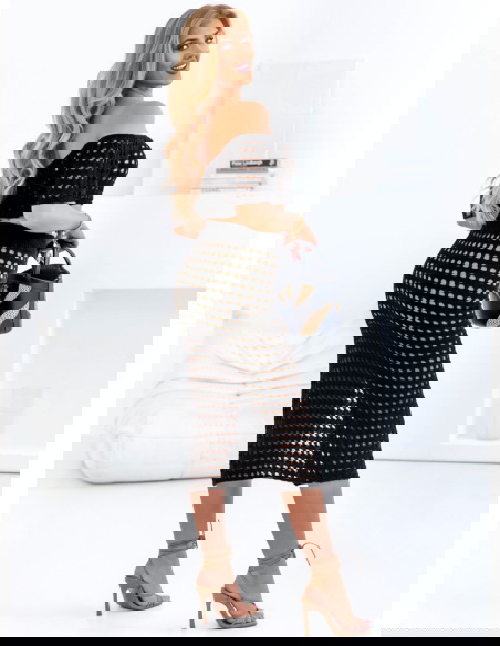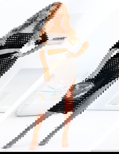 Czarny komplet ażurowy top+spódnica Werilla to propozycja dla kobiet, które kochają nowoczesny, odważny styl i chcą wyróżniać się w tłumie. Komplet zachwyca oryginalną formą i ażurowym splotem, który nadaje mu lekkości i zmysłowego charakteru. Krótki top z dekoltem typu hiszpanka pięknie eksponuje ramiona, a elastyczna forma świetnie dopasowuje się do sylwetki. Spódnica midi z wysokim stanem i seksownym rozcięciem z boku subtelnie podkreśla nogi i optycznie wydłuża sylwetkę. Całość tworzy spójną i bardzo efektowną stylizację, która idealnie sprawdzi się na lato. Ażurowy wzór dodaje lekkości, a czarny kolor równoważy stylizację i wprowadza nutę elegancji. Ten komplet to połączenie luzu, kobiecości i odwagi – idealny dla pewnych siebie kobiet. Możesz założyć go zarówno na plażę, jak i na wieczorne wyjście w wakacyjnym klimacie. Wystarczy kilka dodatków, by całkowicie zmienić jego charakter. To zdecydowany hit sezonu!